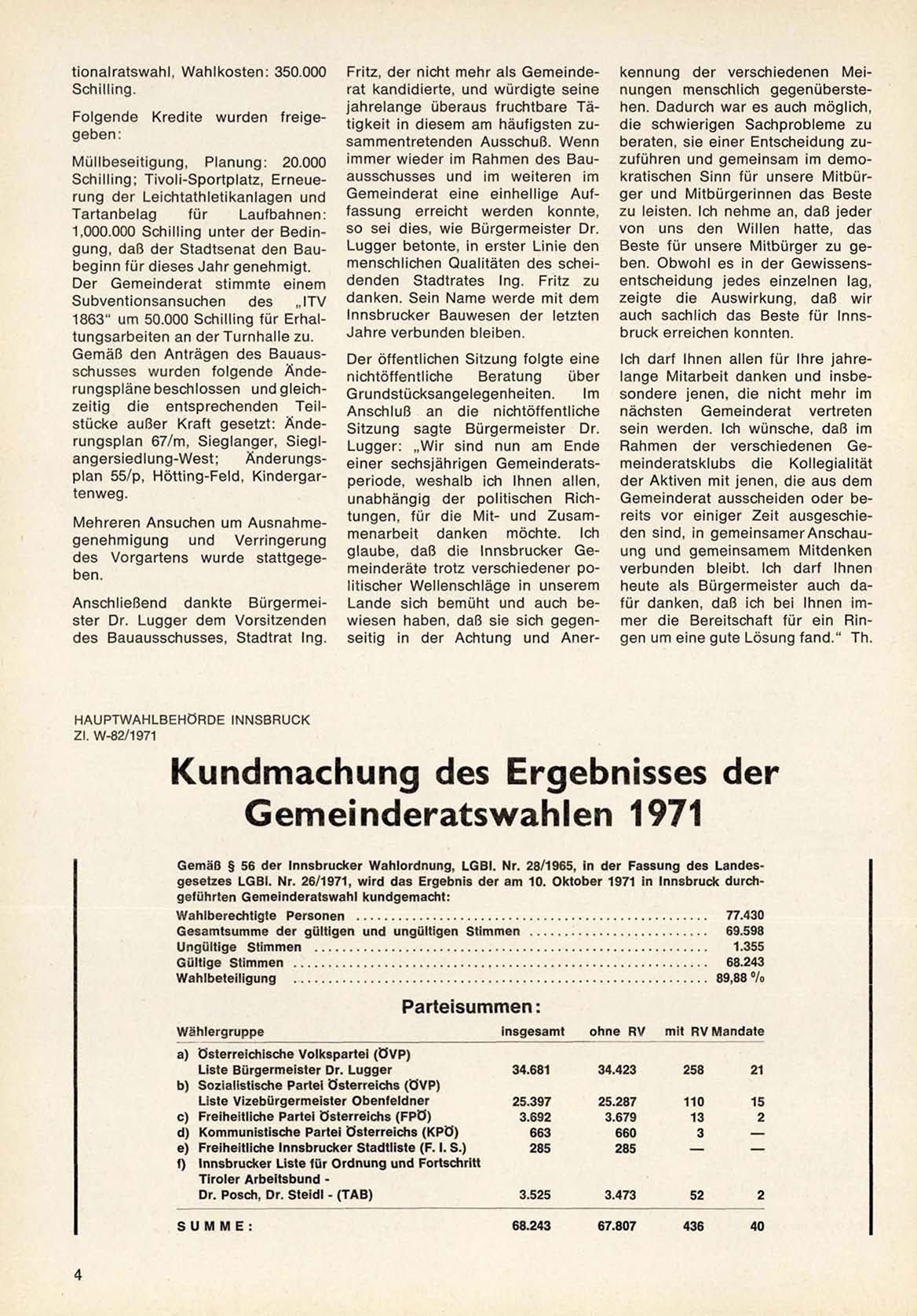 Gemäß § 56 der Innsbrucker Wahlordnung, LGBI. Nr. 28/1965, in der Fassung des Landesgesetzes LGBI. Nr. 26/1971, wird das Ergebnis der am 10. Oktober 1971 in Innsbruck durchgeführten Gemeinderatswahl kundgemacht: