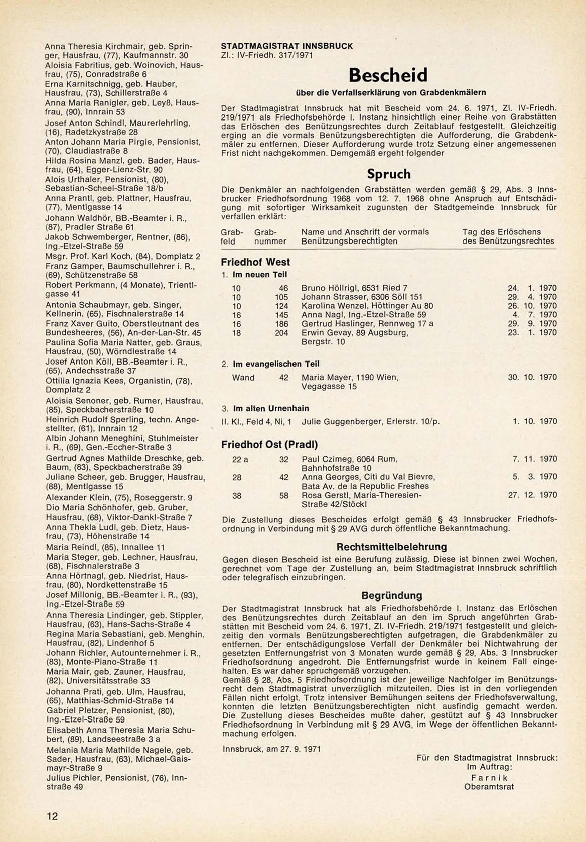 Die Denkmäler an n a c h f o l g e n d e n Grabstätten w e r d e n gemäß § 29, A b s . 3 Innsb r u c k e r F r i e d h o f s o r d n u n g 1968 v o m 12. 7. 1968 o h n e A n s p r u c h auf Entschädig u n g mit sofortiger W i r k s a m k e i t z u g u n s t e n der S t a d t g e m e i n d e Innsbruck für