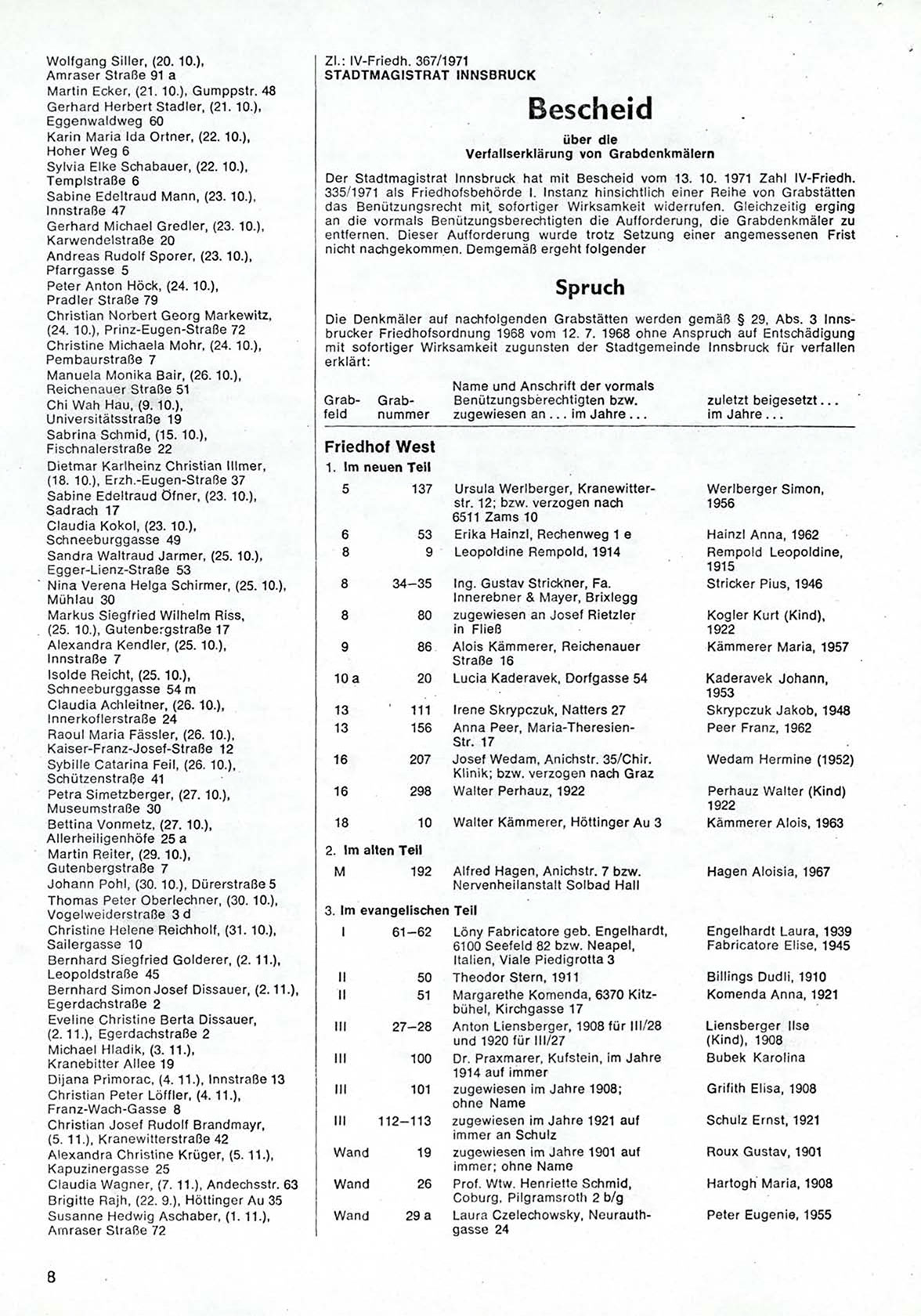 Der S t a d t m a g i s t r a t Innsbruck hat mit B e s c h e i d v o m 13. 10. 1971 Z a h l I V - F r i e d h .