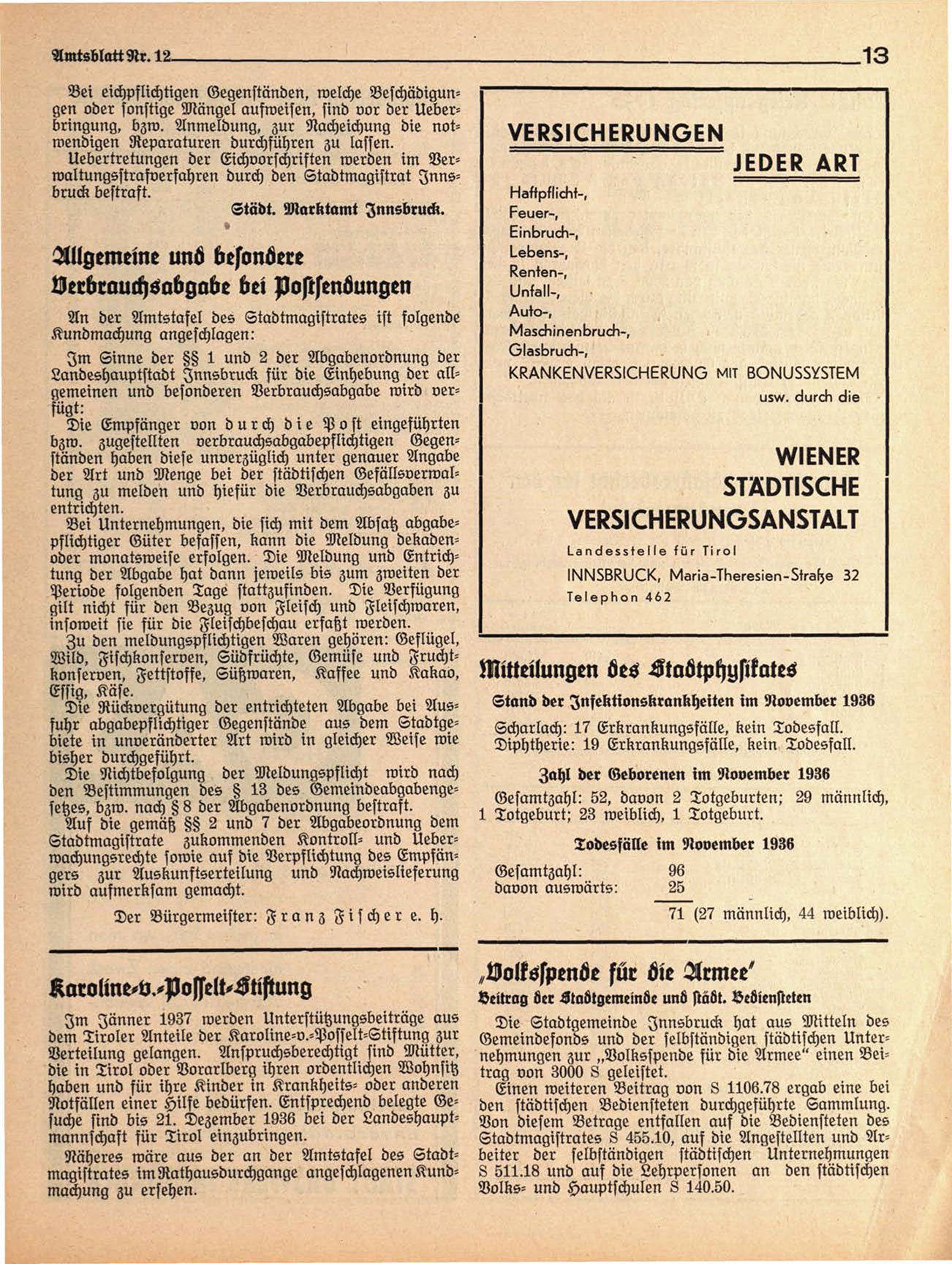 dem Tiroler Anteile der Karoline-v.-Posselt-Stiftung zur Gemeindefonds und der selbständigen städtischen UnterVerteilung gelangen. Anspruchsberechtigt sind Mütter, nehmungen zur „Volksspende für die Armee" einen Beidie in Tirol oder Vorarlberg ihren ordentlichen Wohnsitz trag von 3000 8 geleistet.