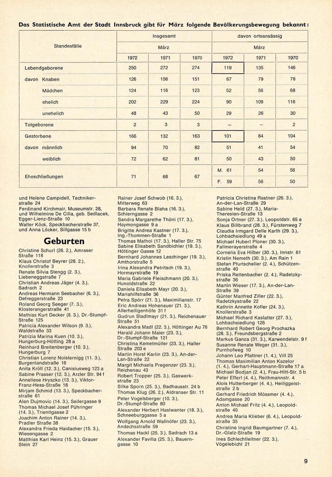 Das Statistische Amt der Stadt Innsbruck gibt für M ä r z folgende Bevölkerungsbewegung bekannt: