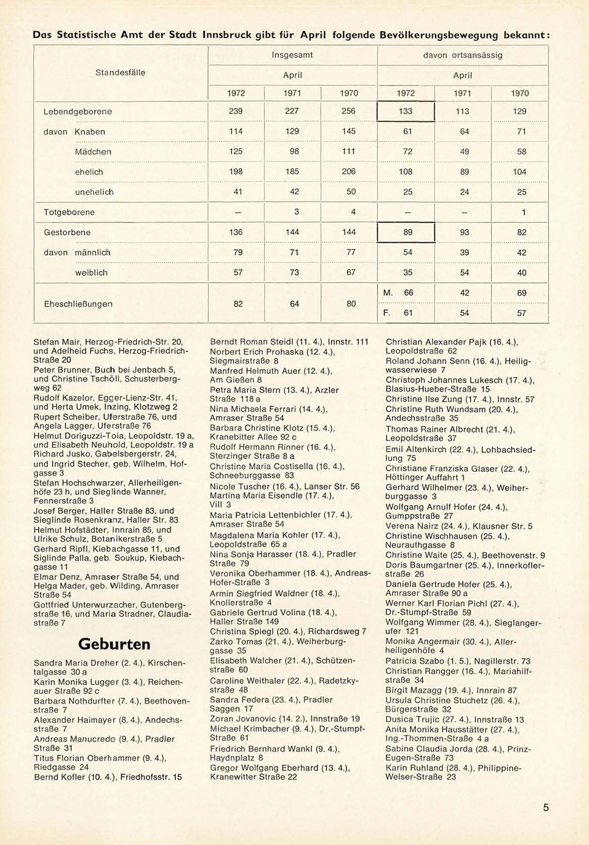 Das Statistische Amt der Stadt Innsbruck gibt für April folgende Bevölkerungsbewegung