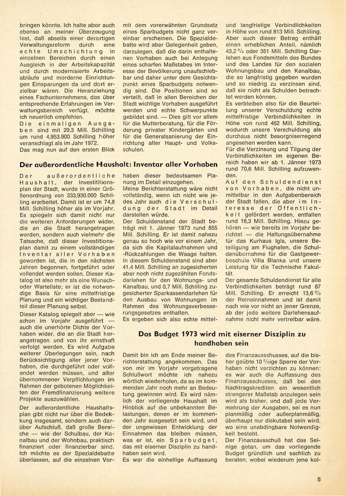 Der S c h u l d e n s t a n d der Stadt beträgt mit 1. Jänner 1973 rund 855