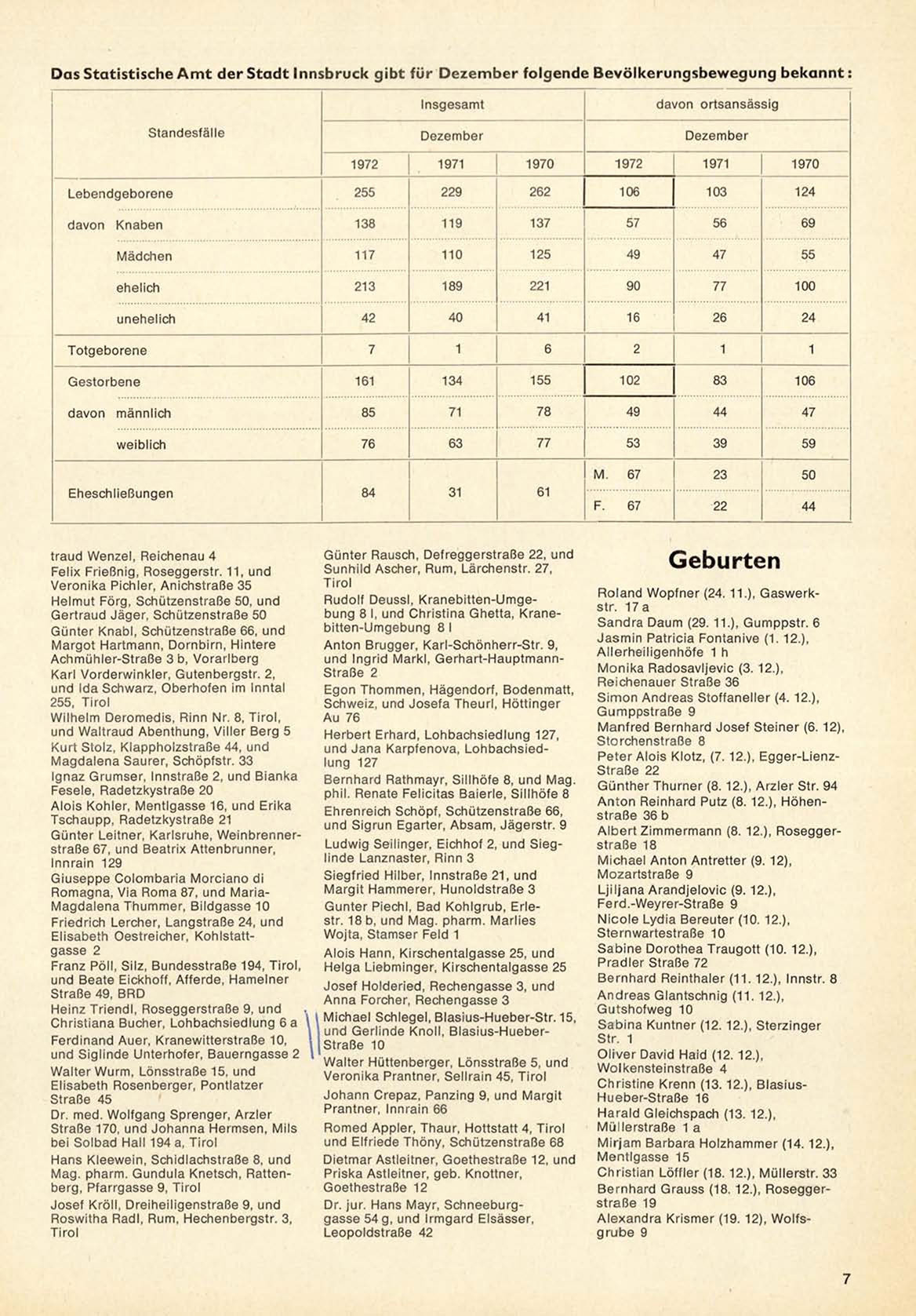 Das Statistische Amt der Stadt Innsbruck gibt für Dezember folgende Bevölkerungsbewegung bekannt