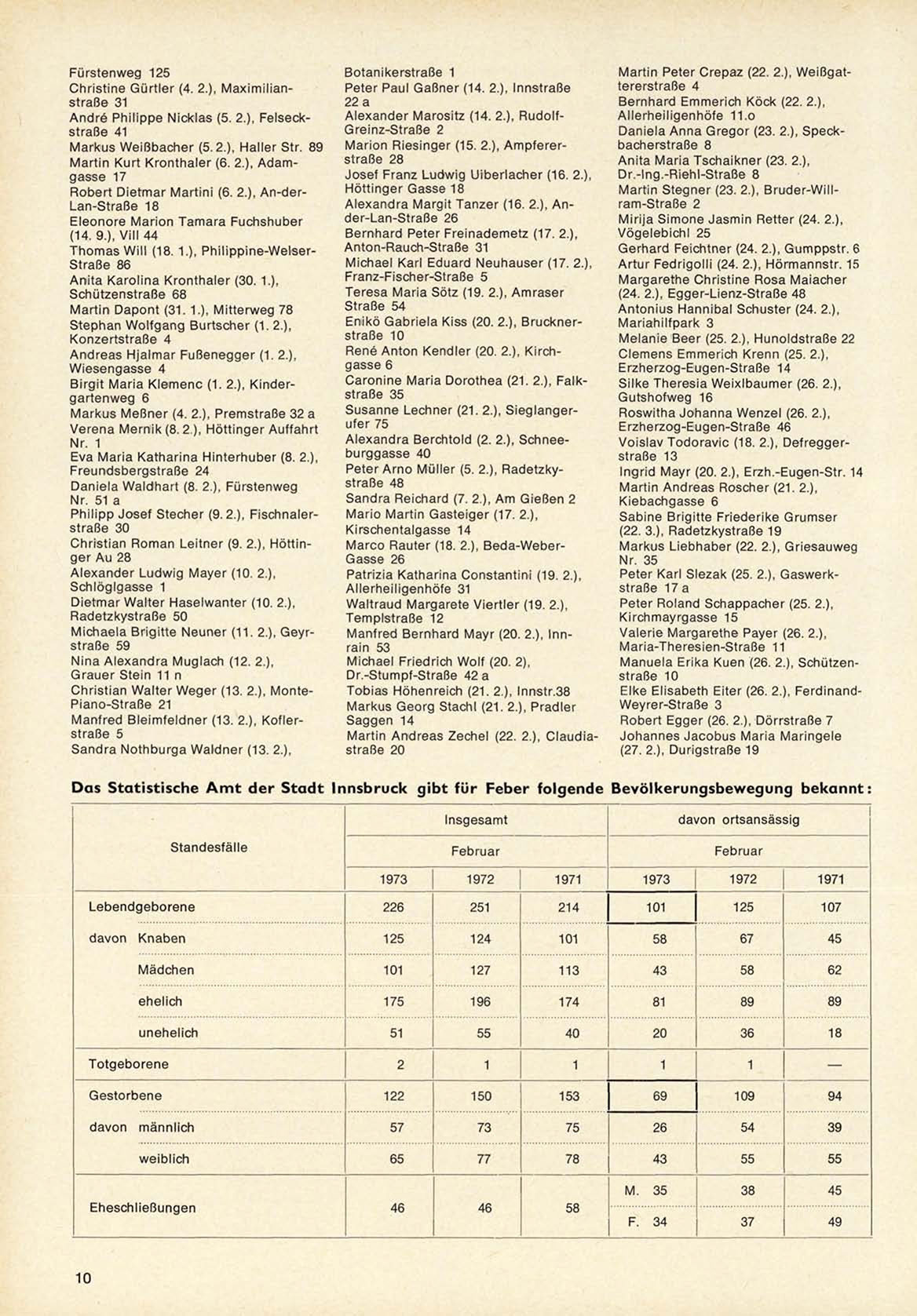 Das Statistische A m t der Stadt Innsbruck gibt für Feber folgende Bevölkerungsbewegung bekannt: