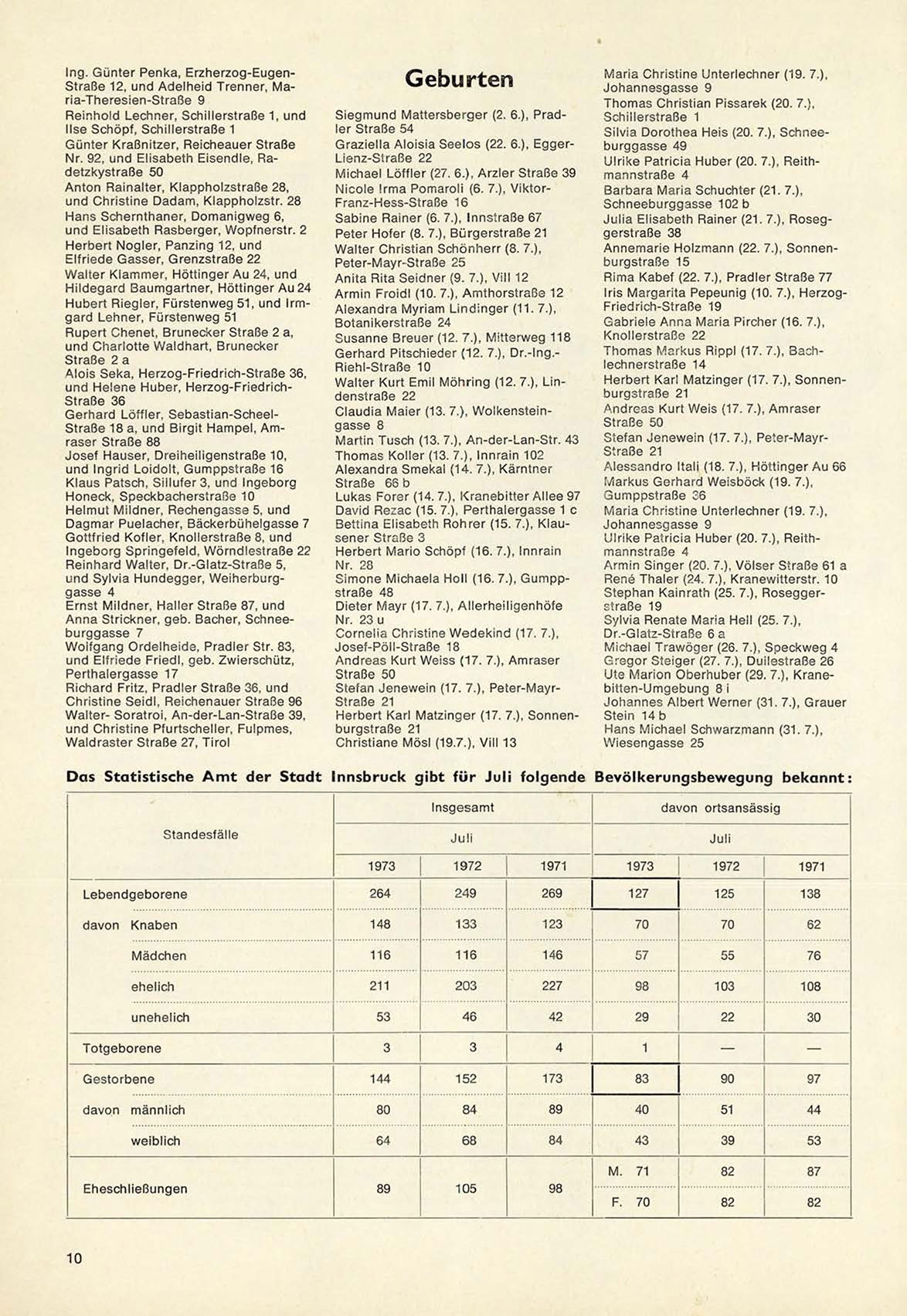 Das Statistische A m t der Stadt Innsbruck gibt für Juii folgende Bevölkerungsbewegung bekannt: