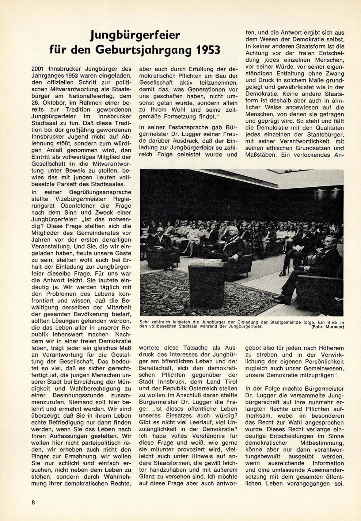 In s e i n e r F e s t a n s p r a c h e gab Bürgermeister Dr. L u g g e r s e i n e r F r e u d e d a r ü b e r A u s d r u c k , daß der E i n ladung zur Jungbürgerfeier s o z a h l reich F o l g e geleistet w u r d e und
