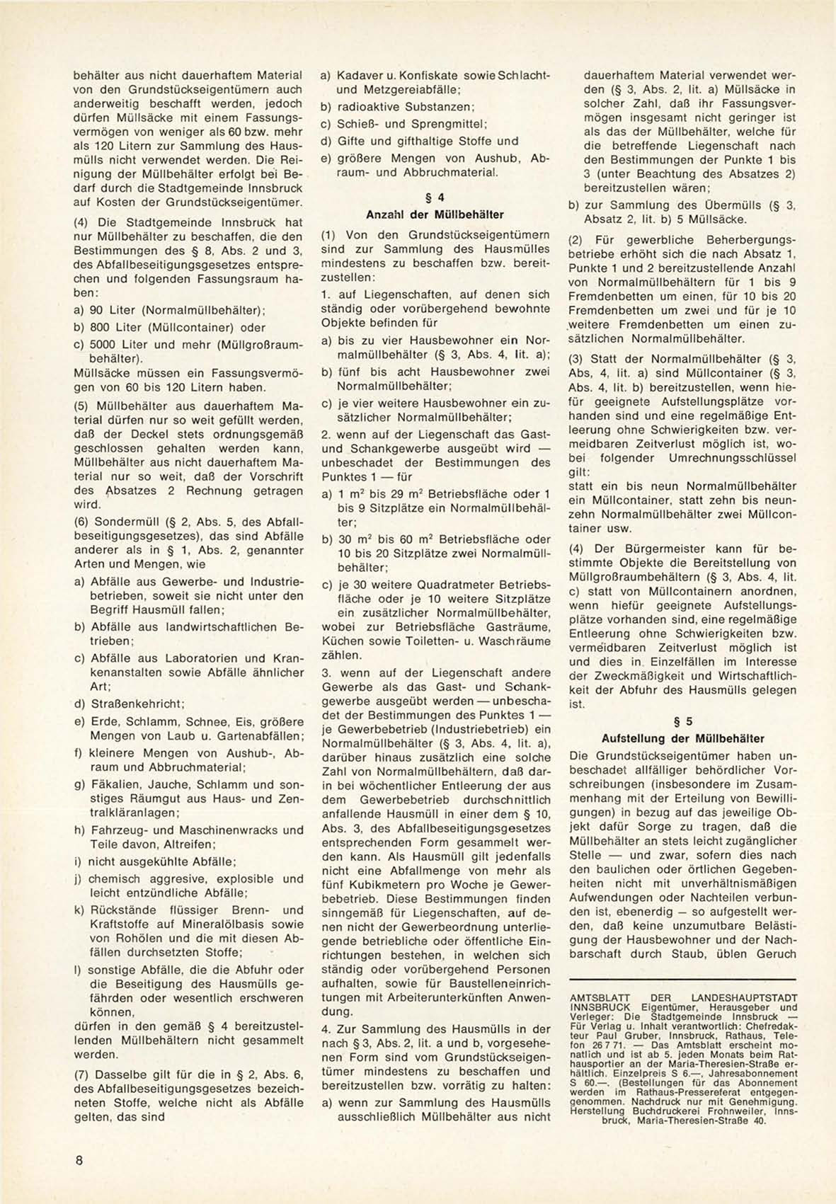 Für V e r l a g u. Inhalt verantwortlich: Chefredakteur Paul G r u b e r , Innsbruck, Rathaus, T e l e fon 26 7 71. — Das Amtsblatt erscheint m o natlich und ist ab 5. jeden Monats b e i m Rathausportier an der Maria-Theresien-Straße erhältlich. E i n z e l p r e i s S 6.—, J a h r e s a b o n n e m e n t