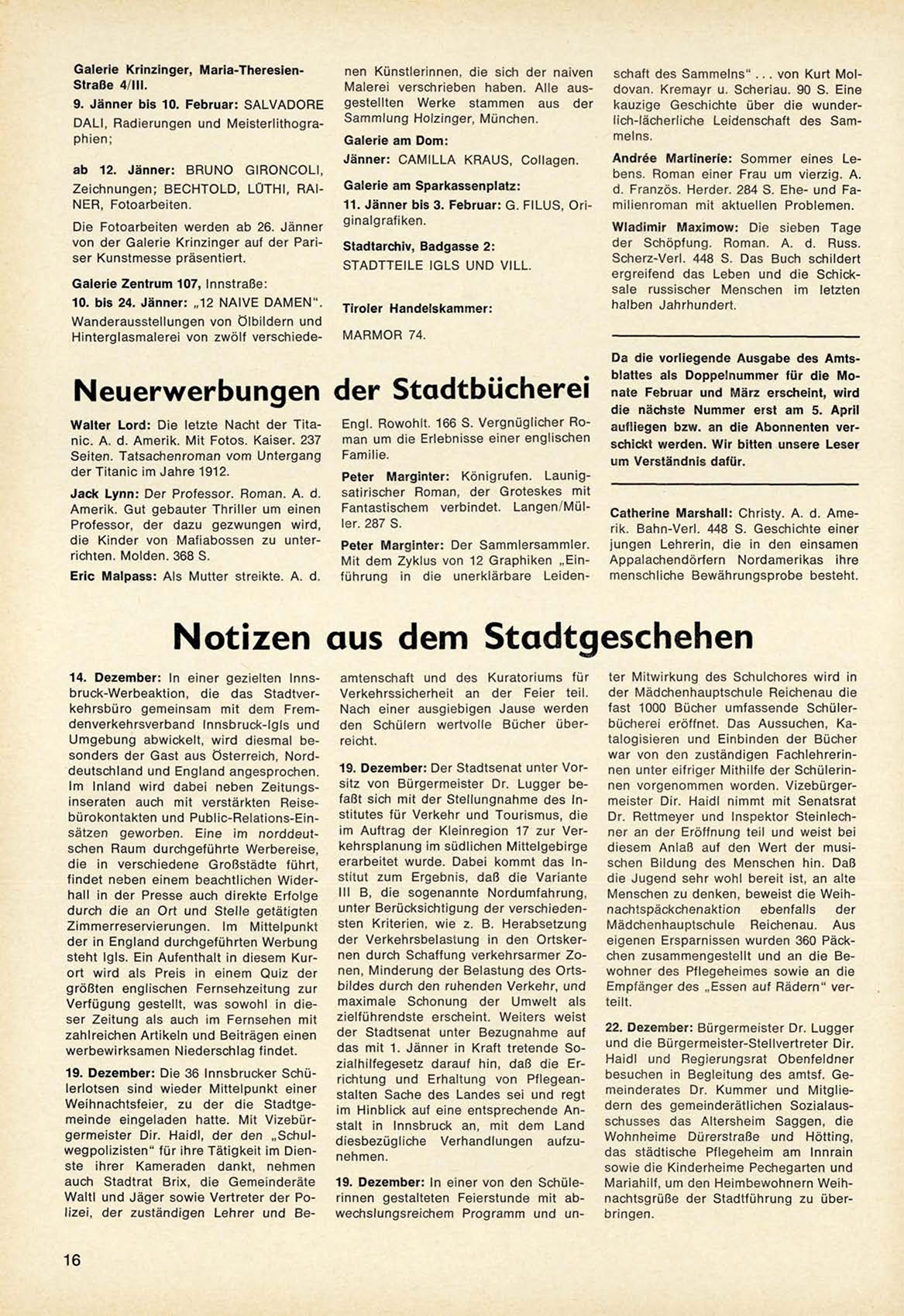 19. Dezember: Der Stadtsenat unter V o r sitz v o n Bürgermeister Dr. L u g g e r b e faßt sich mit der S t e l l u n g n a h m e d e s Institutes für V e r k e h r und T o u r i s m u s , die