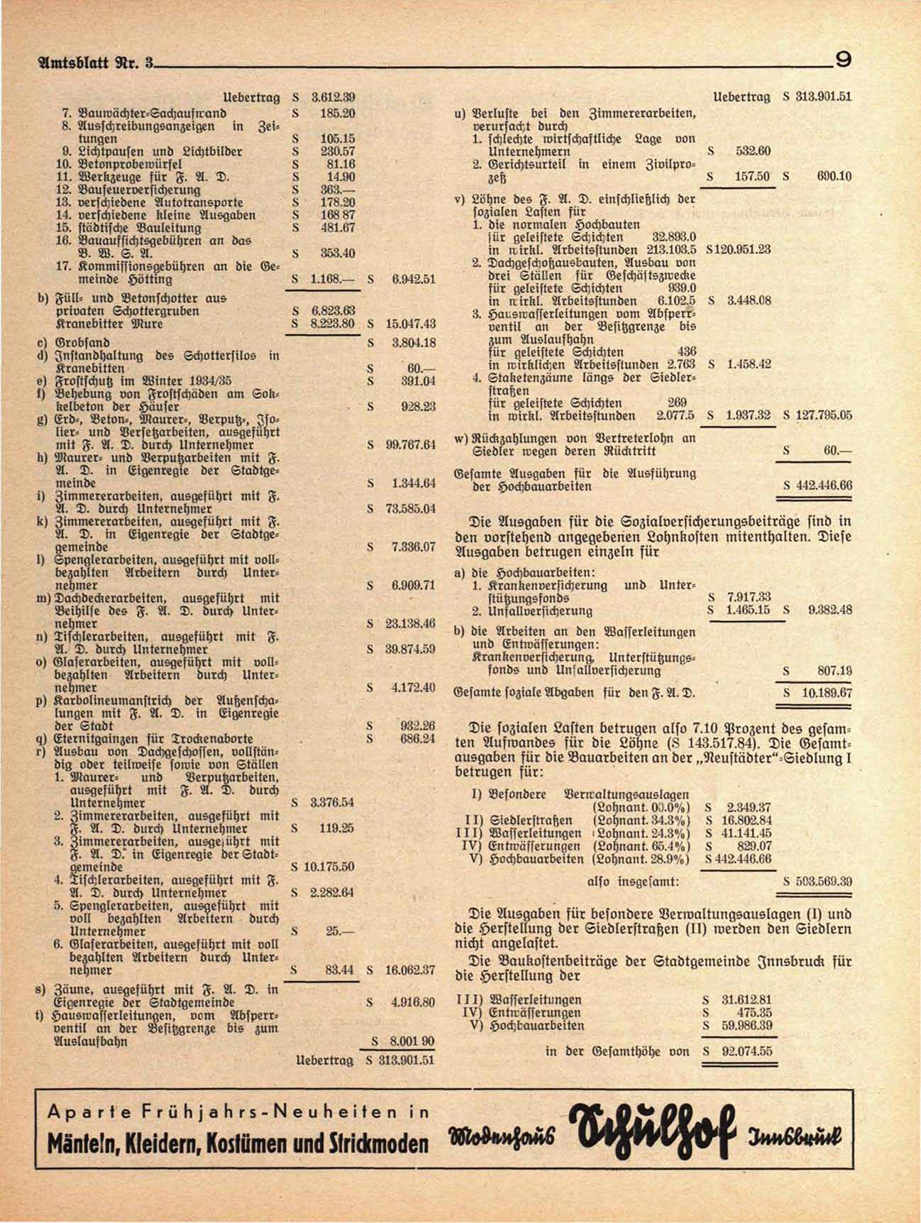 Die sozialen Lasten betrugen also 7.10 Prozent des gesamten Aufwandes für die Löhne (8 143.517.84). Die Gesamtausgaben für die Bauarbeiten an der „Neustädter"-Eiedlung I
