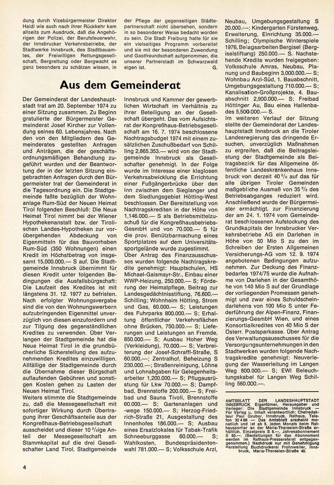 Der G e m e i n d e r a t d e r L a n d e s h a u p t stadt trat am 20. S e p t e m b e r 1974 z u