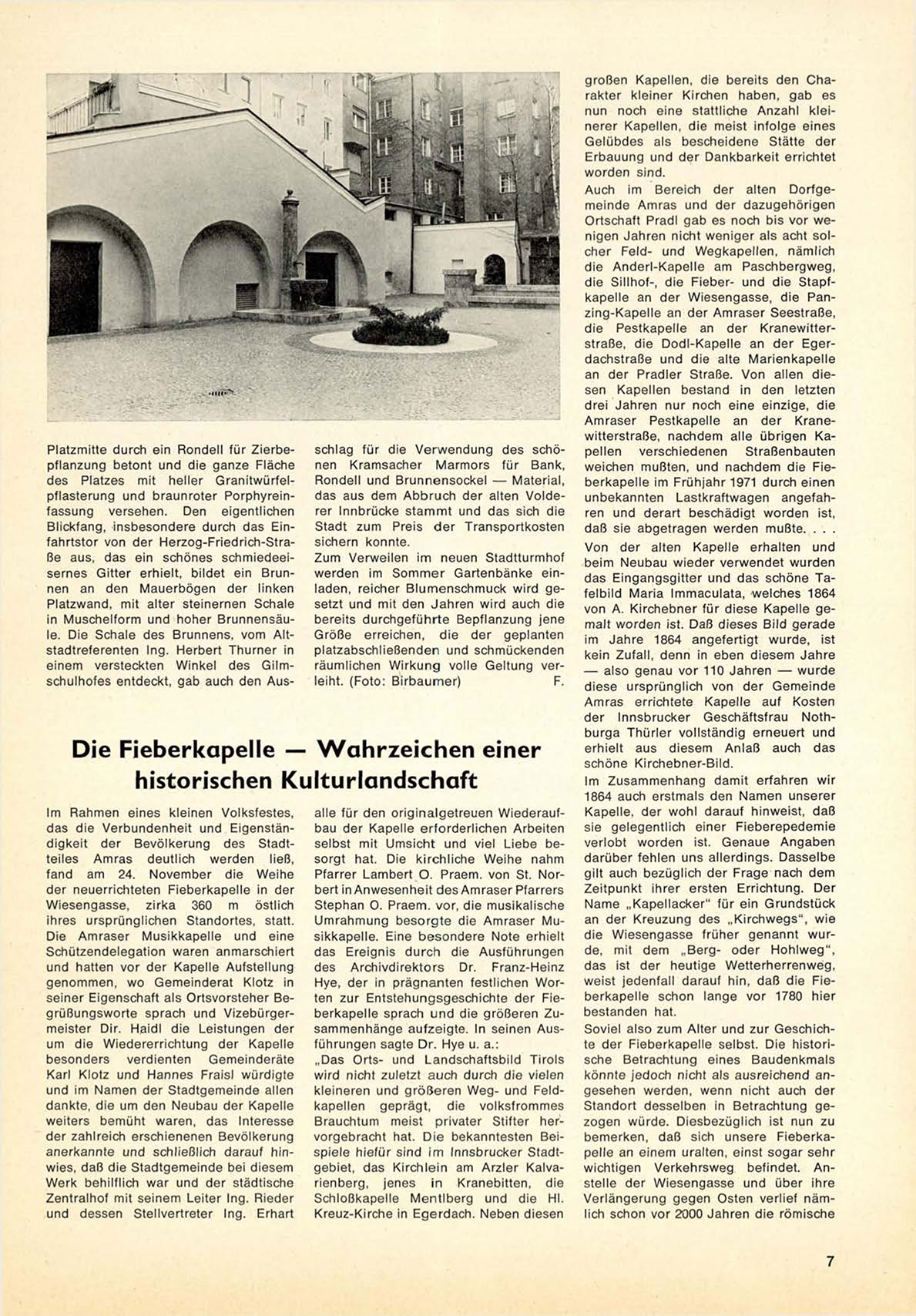 Hye, d e r in p r ä g n a n t e n festlichen W o r ten zur E n t s t e h u n g s g e s c h i c h t e der F i e b e r k a p e l l e s p r a c h u n d die größeren Z u s a m m e n h ä n g e a u f z e i g t e . In s e i n e n A u s f ü h r u n g e n sagte D r . Hye u. a . :