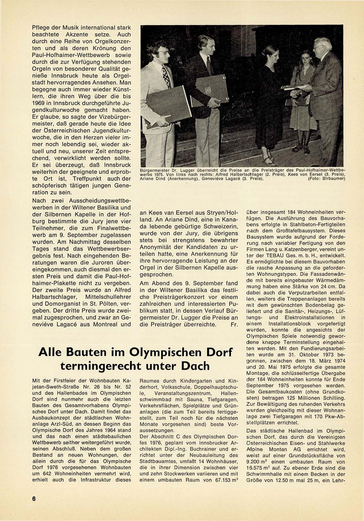 Bürgermeister Dr. Lugger überreicht die Preise an d i e Preisträger des Paul-Hofhaimer-Wettbewerbs 1975. Von links nach rechts: Alfred H a l b a r t s c h l a g e r (2. Preis), Kees von Eersel (3. P r e i s ) ,