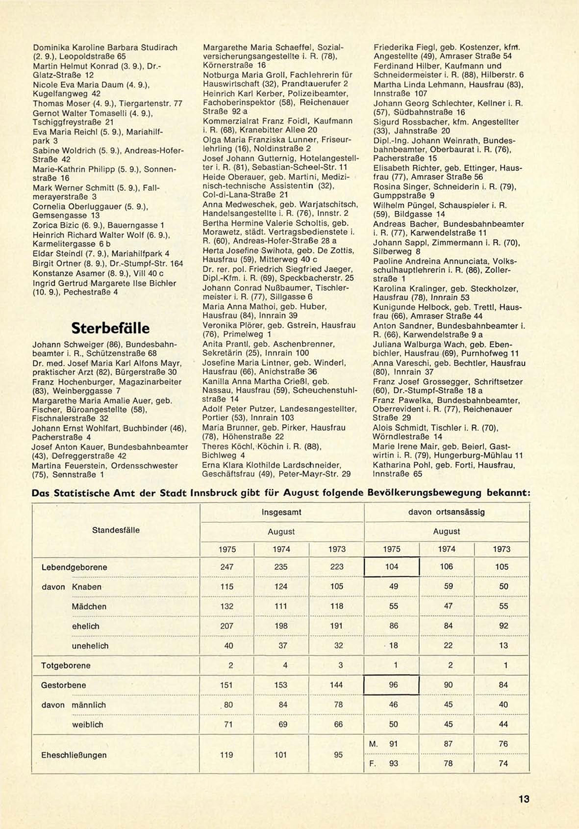 Das Statistische Amt der Stadt Innsbruck gibt für August folgende Bevölkerungsbewegung