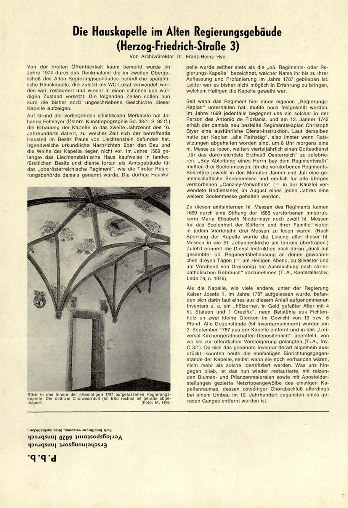 J a h r e 1974 durch d a s D e n k m a l a m t die im z w e i t e n O b e r g e schoß d e s Alten R e g i e r u n r j s g e b ä u d e s befindliche s p ä t g o t i sche H a u s k a p e l l e , d i e zuletzt als W C - L o k a l v e r w e n d e t word e n war, restauriert u n d w i e d e r in e i n e n schönen und würd i g e n Z u s t a n d versetzt. Die f o l g e n d e n Z e i l e n s o l l e n nun
