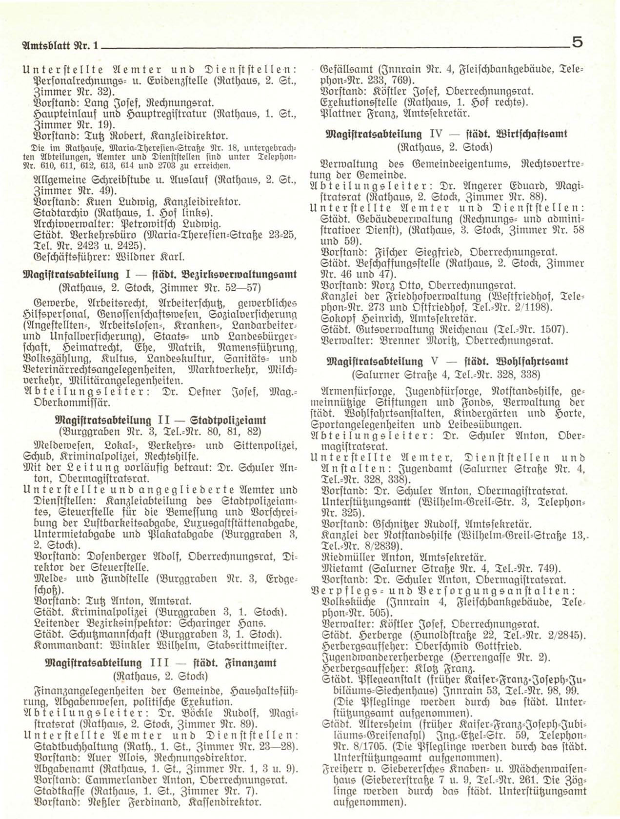 Die im Rathause, Maria-Theresien-Straße Nr. 18, untergebrachten Abteilungen, Aemter und Dienststellen sind unter TelephonNr. 610, 611. 612, 613, 614 und 2703 zu erreichen.
