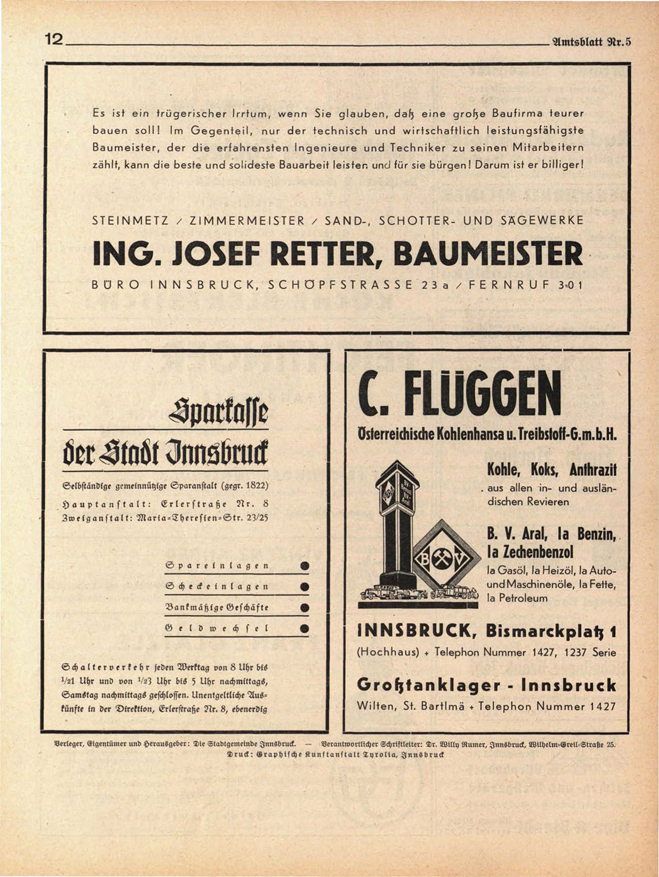 Verleger, Eigentümer und Herausgeber: Die Stadtgemeinde Innsbruck. — Verantwortlicher Schriftleiter: Nr. Willy Rumer, Innsbruck, Wilhelm-Vreil-Straße 25.