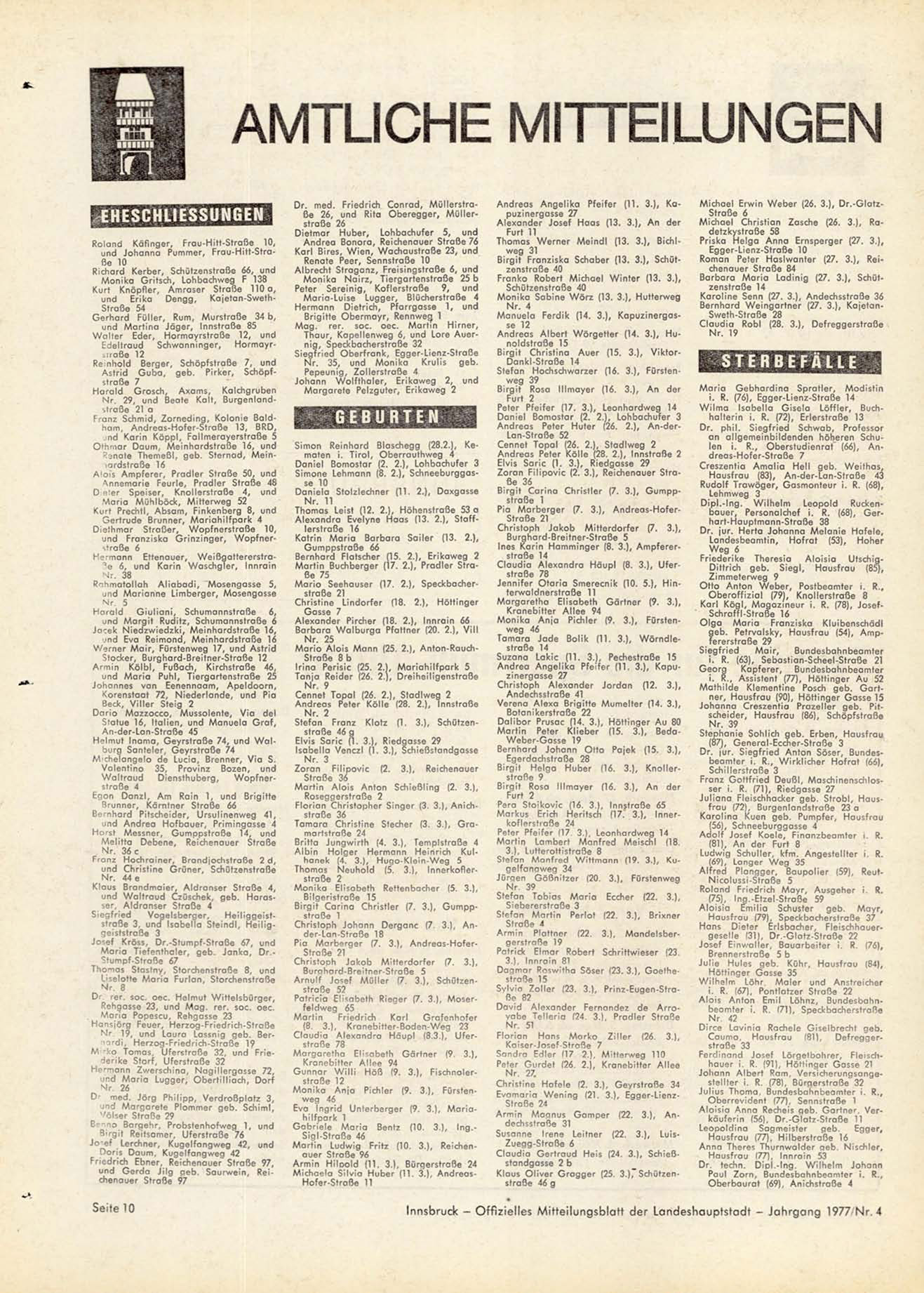 Innsbruck - Offizielles Mitteilungsblatt der Landeshauptstadt - Jahrgang 1977"Nr. 4