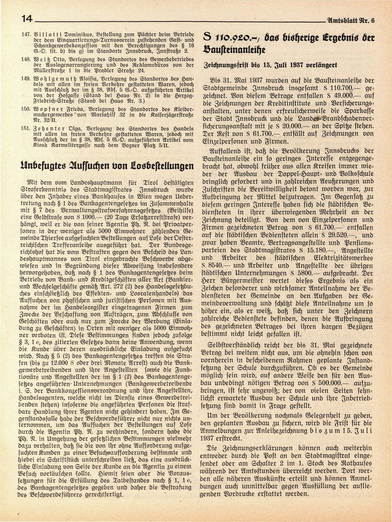 der Stadt Innsbruck und die Landes-Brandschadenversicherungsanstalt mit je 8 20.000.— an der Spitze stehen.