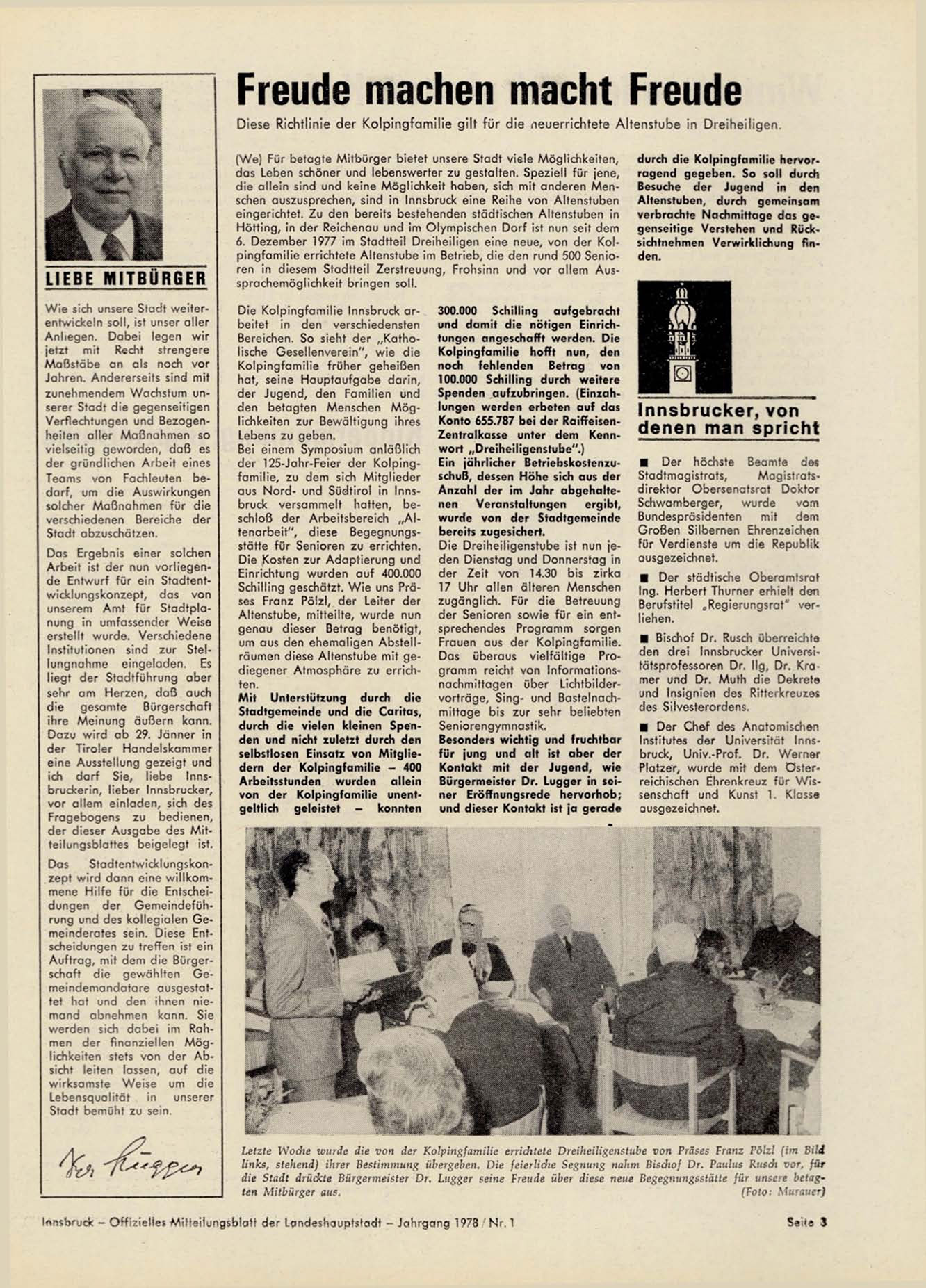 6. D e z e m b e r 1977 im Stadtteil D r e i h e i l i g e n eine neue, v o n der K o l p i n g f a m i l i e errichtete A l t e n s t u b e im Betrieb, d i e d e n rund 500 S e n i o ren in d i e s e m Stadtteil Z e r s t r e u u n g , Frohsinn und v o r a l l e m A u s sprachemöglichkeit b r i n g e n soll.