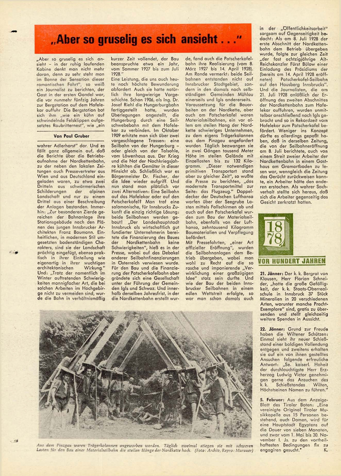 a u c h auf d e n P a t s c h e r k o f e l wurd e n z u m B a u der M a t e r i a l s e i l b a h n , e b e n f a l l s v o n der Lufthansa, zehntausend Kilogramm