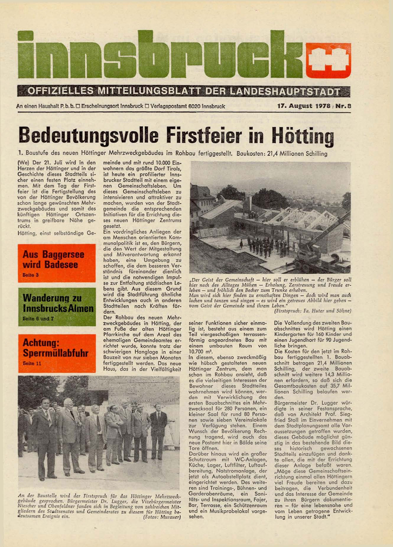 1. Baustufe des neuen Höttinger Mehrzweckgebäudes im Rohbau fertiggestellt. Baukosten: 21,4 Millionen Schilling
