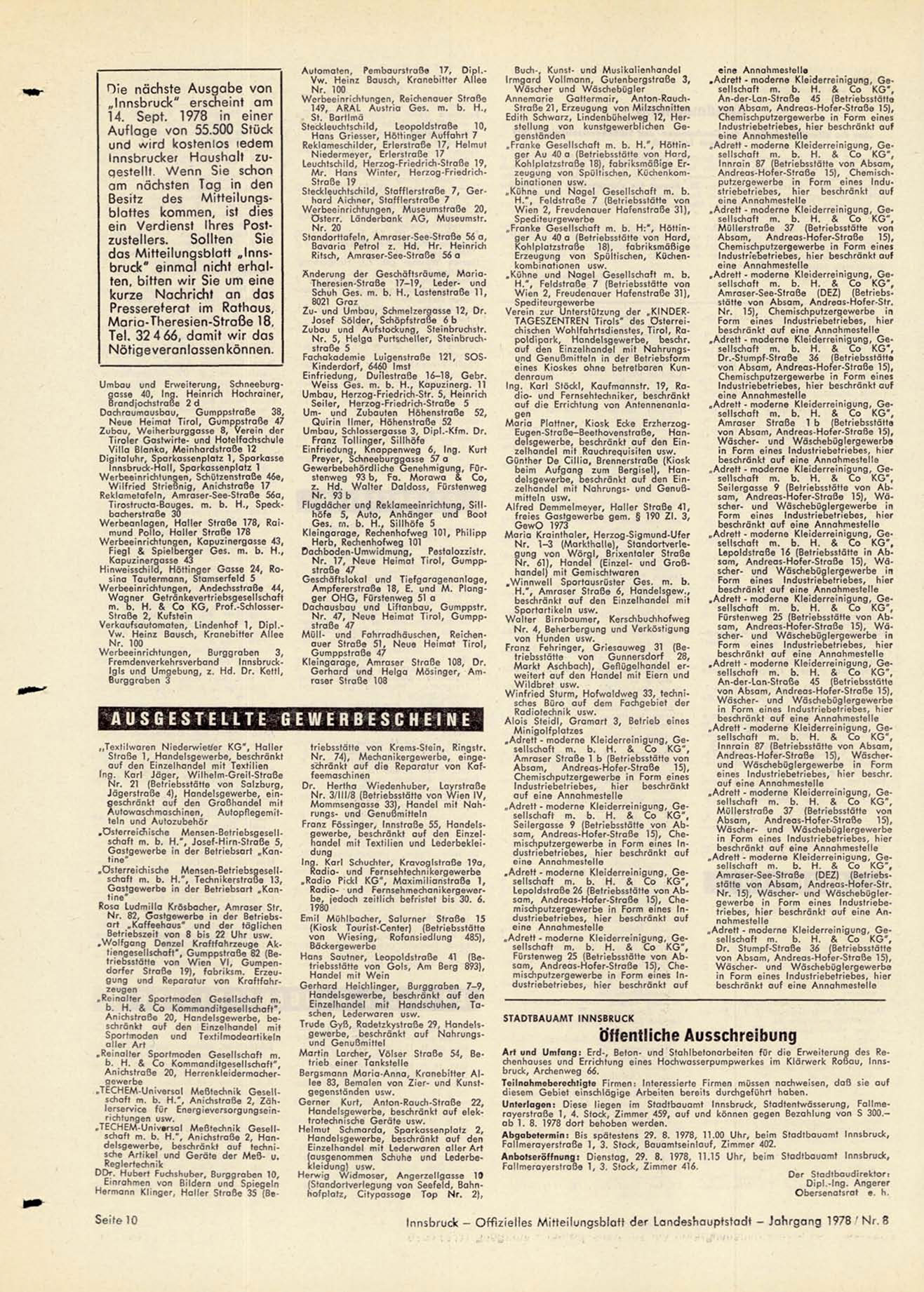 Anbotseröffnung: Dienstag, 29. 8. 1978, 11.15 Uhr, beim Stadtbauamt Innsbruck,