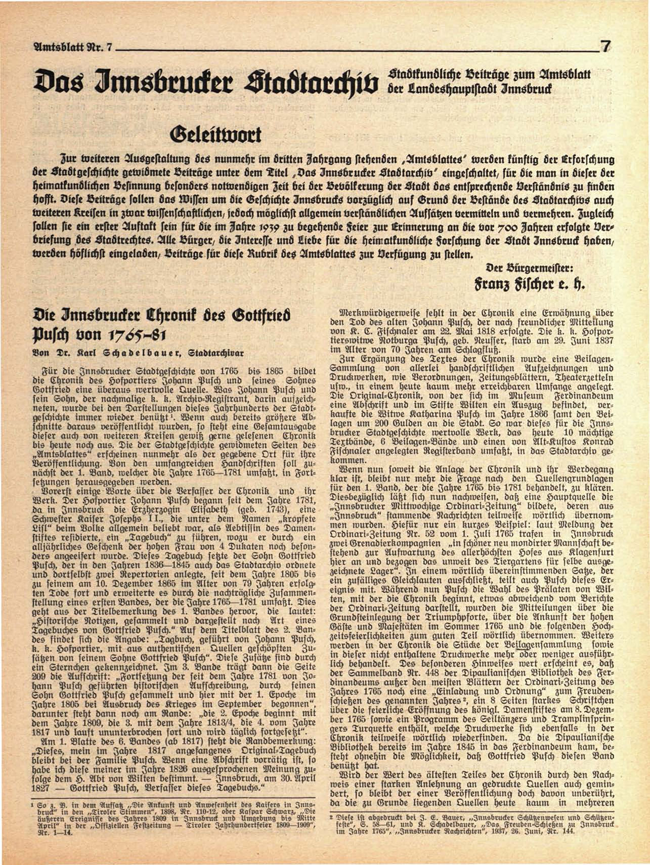 sein Sohn, der nachmalige k. k. Archiv-Registrant, darin auszeichneten, wurde bei den Darstellungen dieses Jahrhunderts der Stadtgeschichte immer wieder benützt". Wenn auch bereits größere Abschnitte daraus veröffentlicht wurden, so steht eine Gesamtausgabe