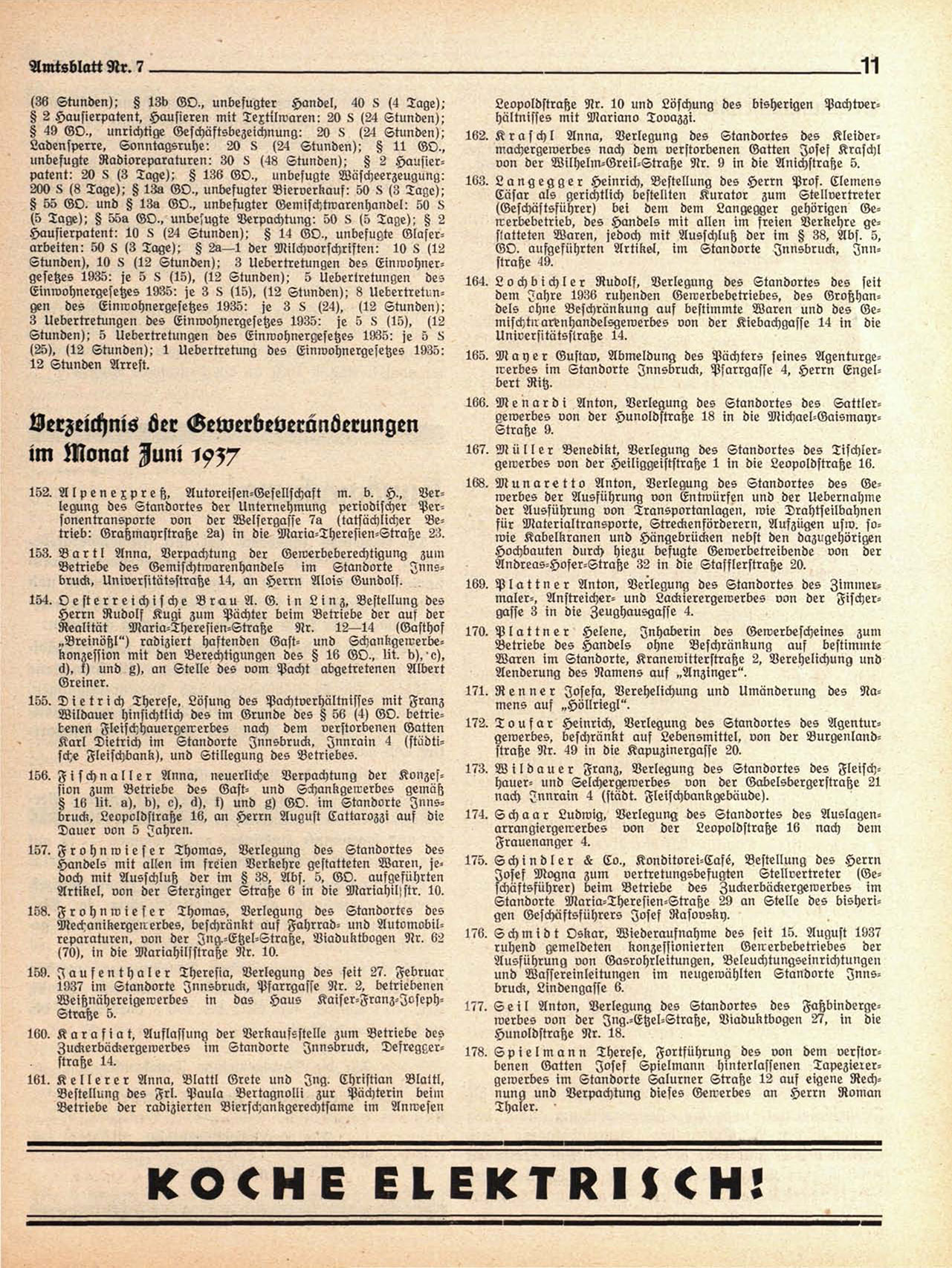 1937 im Standorte Innsbruck, Pfarrgasse Nr. 2. betriebenen