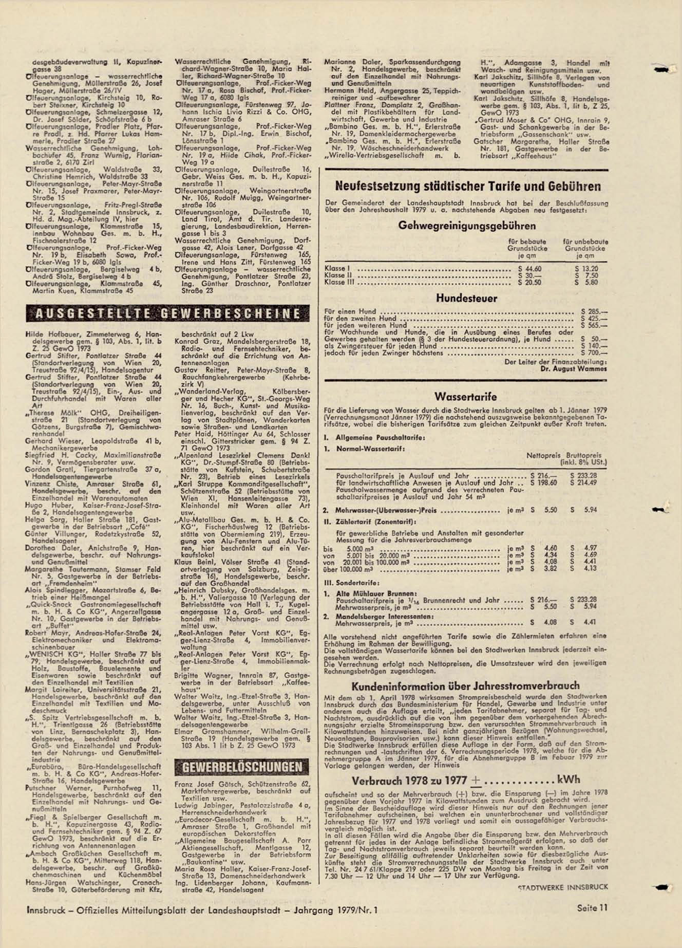 Für die L i e f e r u n g v o n W a s s e r d u r c h die S t a d t w e r k e I n n s b r u c k g e l t e n a b 1. J ä n n e r 1979