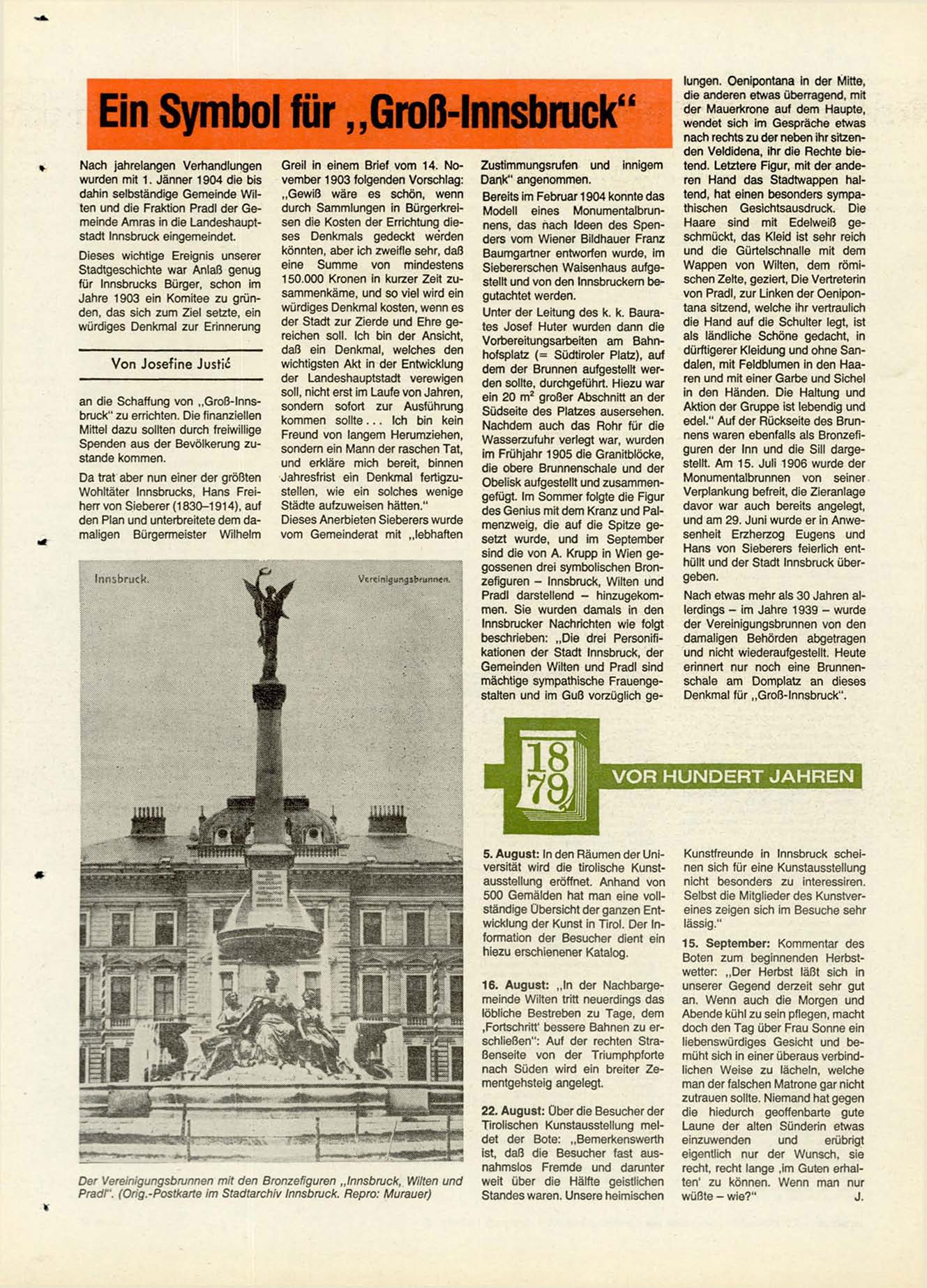 edel." Auf der Rückseite des Brunnens waren ebenfalls als Bronzefiguren der Inn und die Sill dargestellt. Am 15. Juli 1906 wurde der