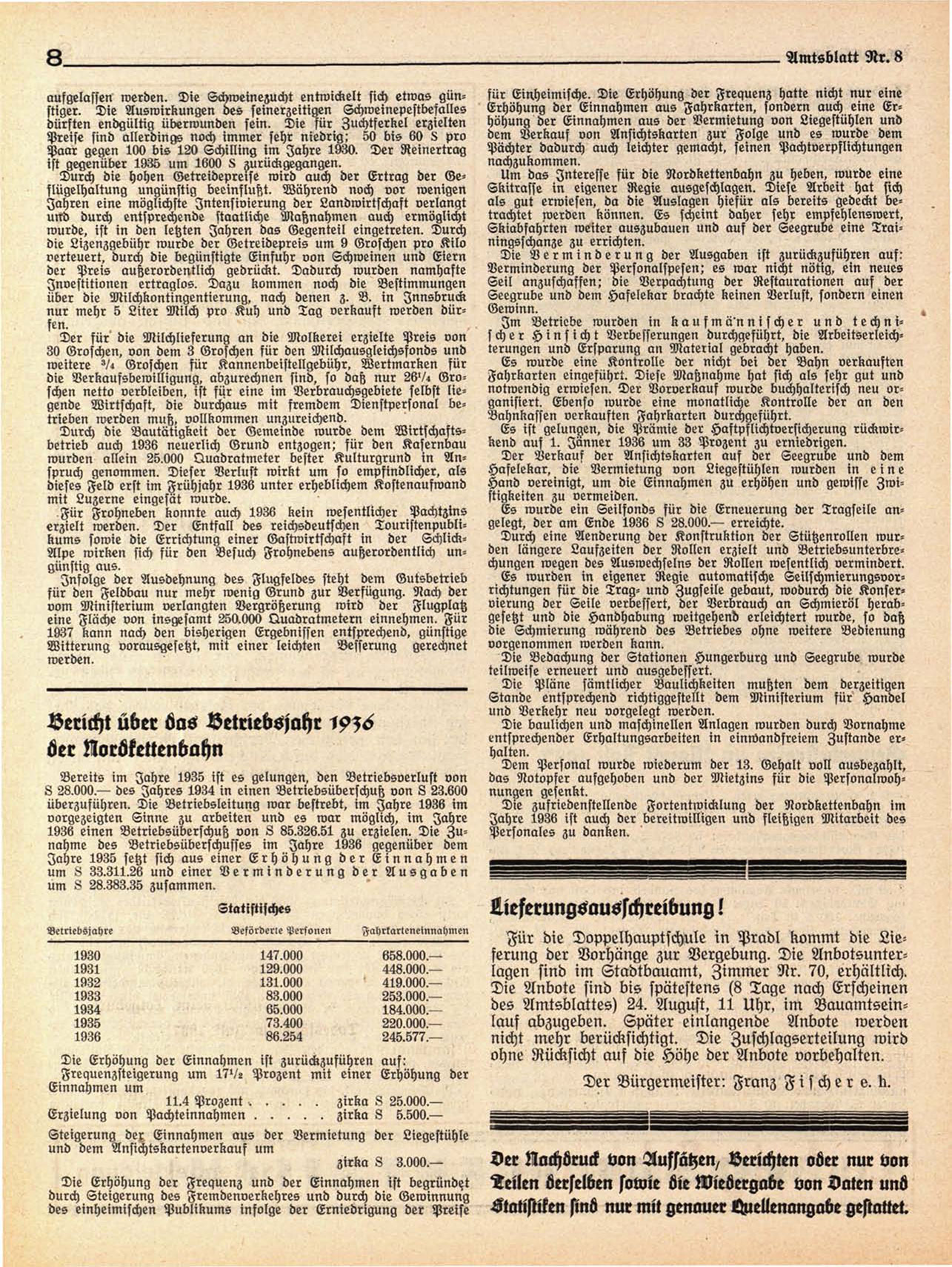 Es ist gelungen, die Prämie der Haftpflichtversicherung rückwirkend auf 1. Jänner 1936 um 33 Prozent zu erniedrigen.