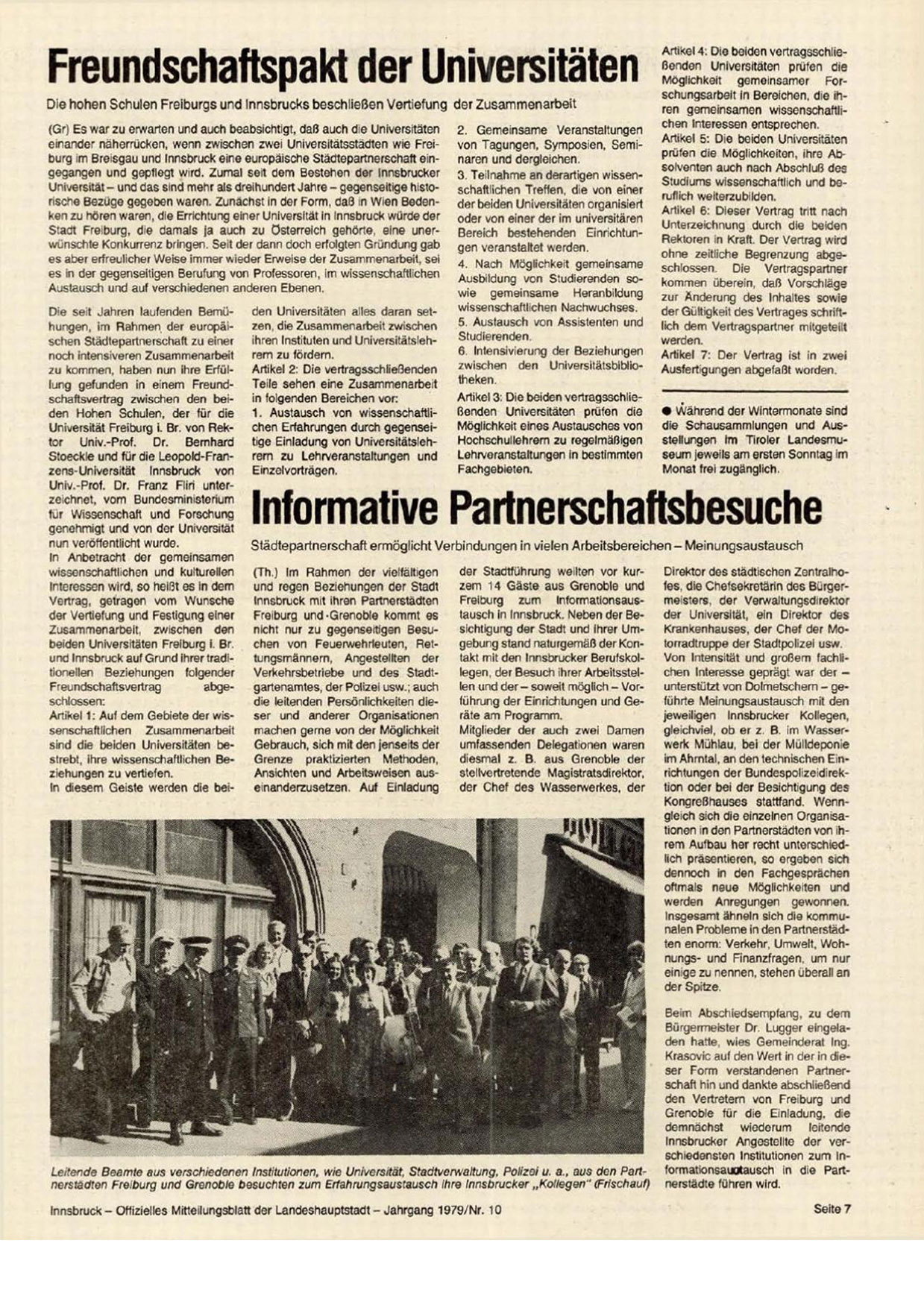 Die seit Jahren laufenden Bemühungen, im Rahmen der europälschen Städtepartnerschaft zu einer noch intensiveren Zusammenarbeit zu kommen, haben nun ihre Erfüllung gefunden in einem Freundschaftsvertrag zwischen den beiden Hohen Schulen, der für die Universität Freiburg i. Br. von Rektor Univ.-Prof. Dr. Bernhard Stoeckle und für die Leopold-Franzens-Universität Innsbruck von