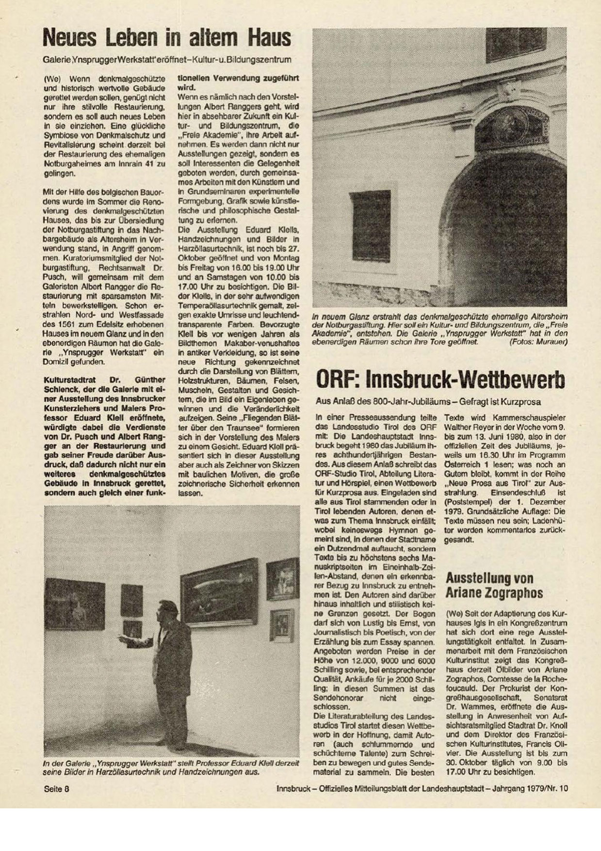 Kulturstadtrat Dr. Günther Schlenck, der die Galerie mit einer Ausstellung des Innsbrucker Kunsterziehers und Malers Professor Eduard Klell eröffnete, würdigte dabei die Verdienste von Dr. Pusch und Albert Rangger an der Restaurierung und gab seiner Freude darüber Ausdruck, daß dadurch nicht nur ein weiteres denkmalgeschütztes Gebäude in Innsbruck gerettet, sondern auch gleich einer funk