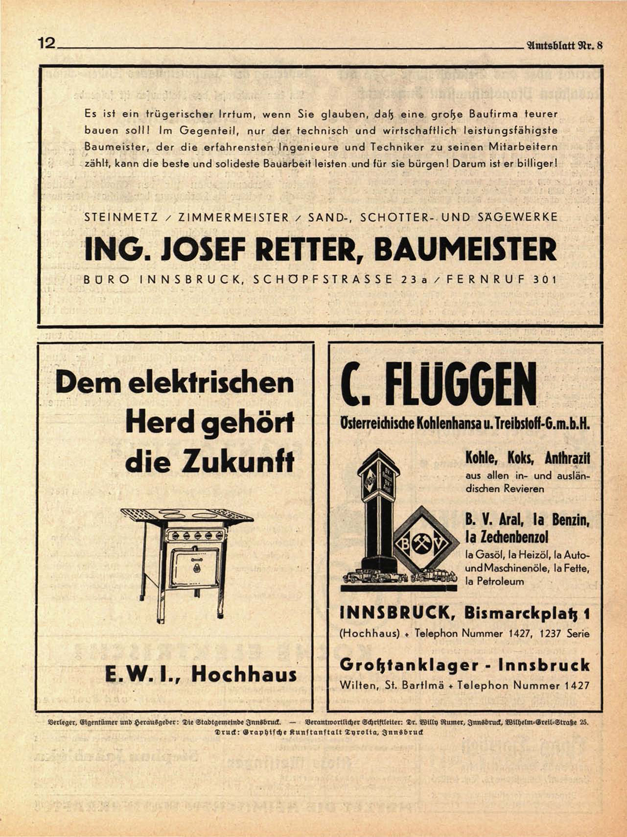 Verleger, Eigentümer und Herausgeber: Die Stadtgemeinde Innsbruck. — Verantwortlicher Schriftleiter: 3>r. Willy Numer, Innsbruck, Wllhelm-Vreil-Strahe 25.