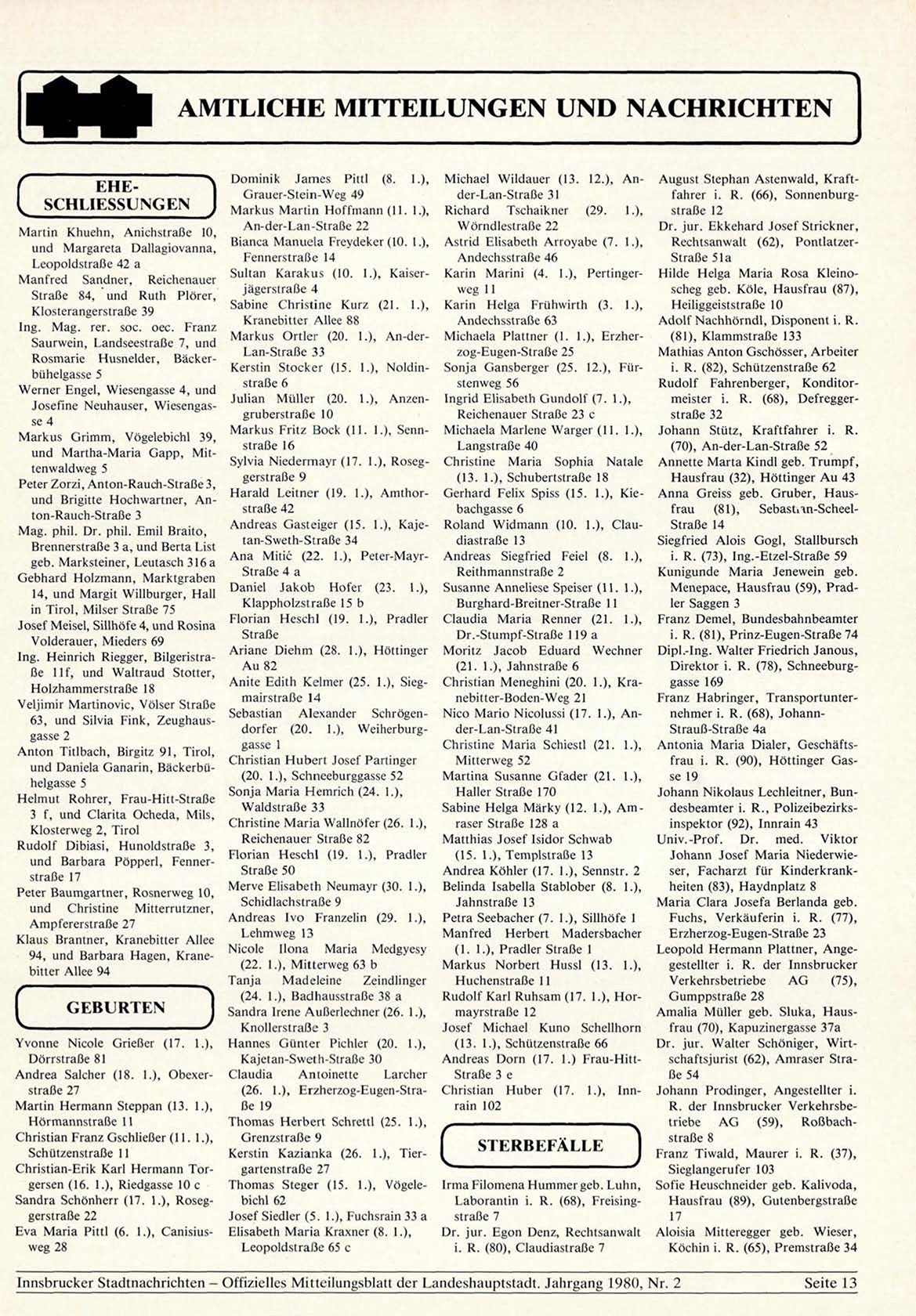 Innsbrucker Stadtnachrichten - Offizielles Mitteilungsblatt der Landeshauptstadt. Jahrgang 1980, N r . 2