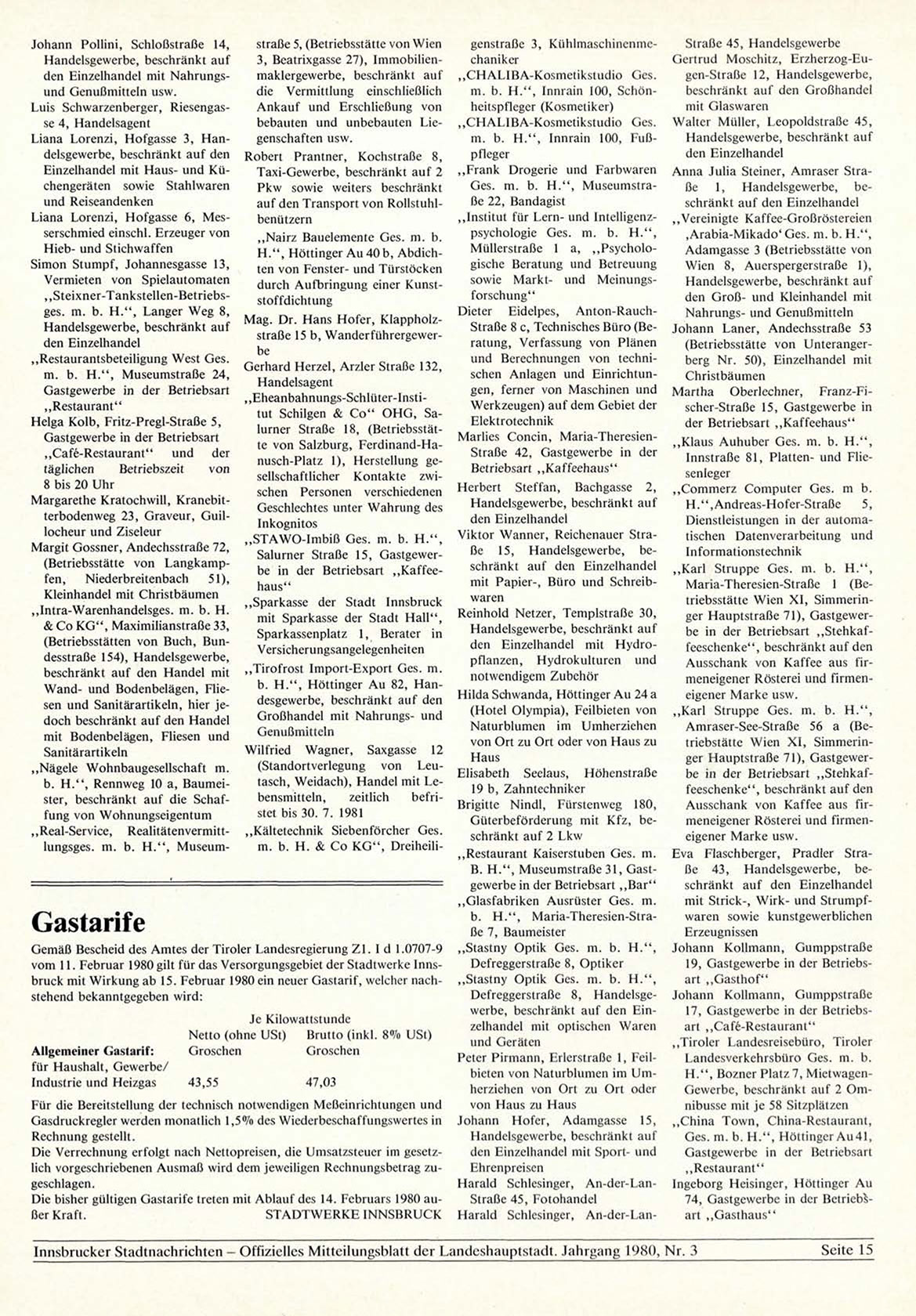 vom 11. Februar 1980 gilt f ü r das Versorgungsgebiet der Stadtwerke Innsbruck mit W i r k u n g ab 15. Februar 1980 ein neuer Gastarif, welcher nachstehend bekanntgegeben wird: