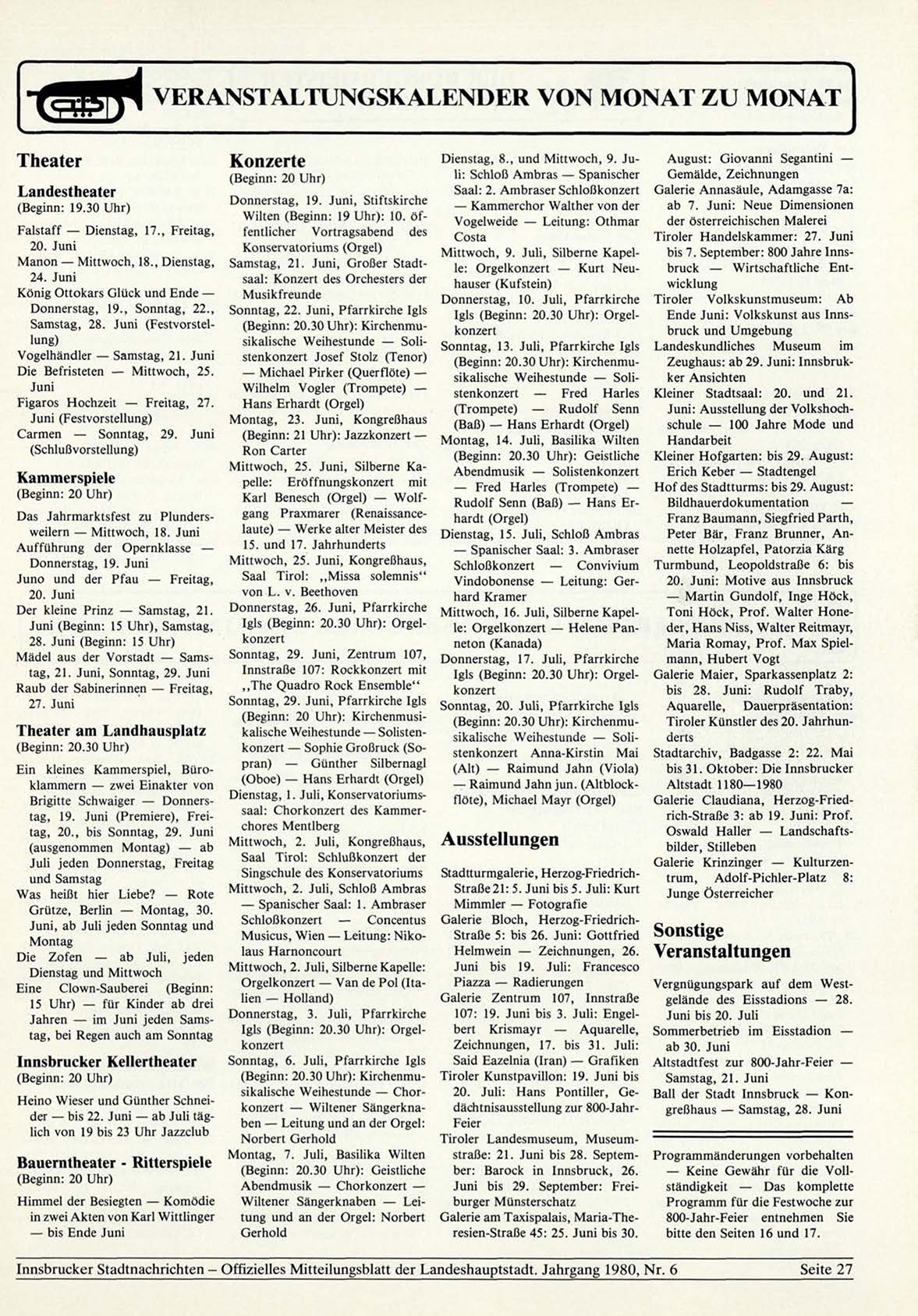 Innsbrucker Stadtnachrichten - Offizielles Mitteilungsblatt der Landeshauptstadt. Jahrgang 1980, N r . 6