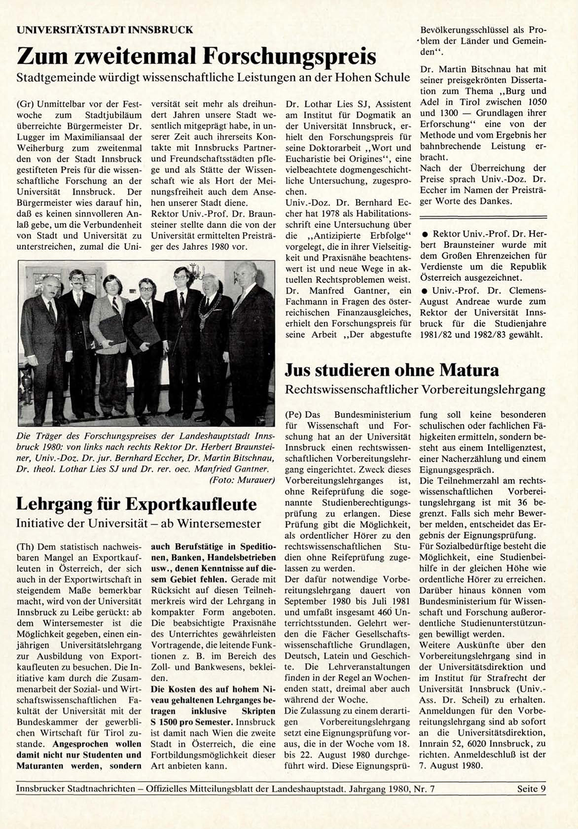 bruck 1980: von links nach rechts Rektor Dr. Herbert Braunstei- Innsbruck einen rechtswissenner, Univ.-Doz. Dr.jur. Bernhard Eccher, Dr. Martin Bitschnau, schaftlichen VorbereitungslehrDr. theol. Lothar Lies SJ und Dr. rer. oec. Manfried Gantner.