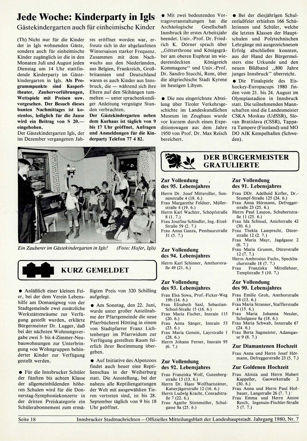 Innsbrucker Stadtnachrichten - Offizielles Mitteilungsblatt der Landeshauptstadt. Jahrgang 1980, N r . 7