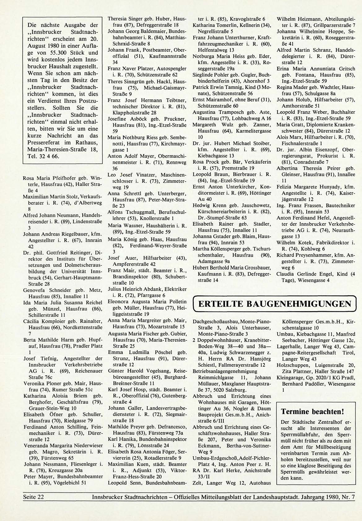 Innsbrucker Stadtnachrichten - Offizielles Mitteilungsblatt der Landeshauptstadt. Jahrgang 1980, Nr. 7