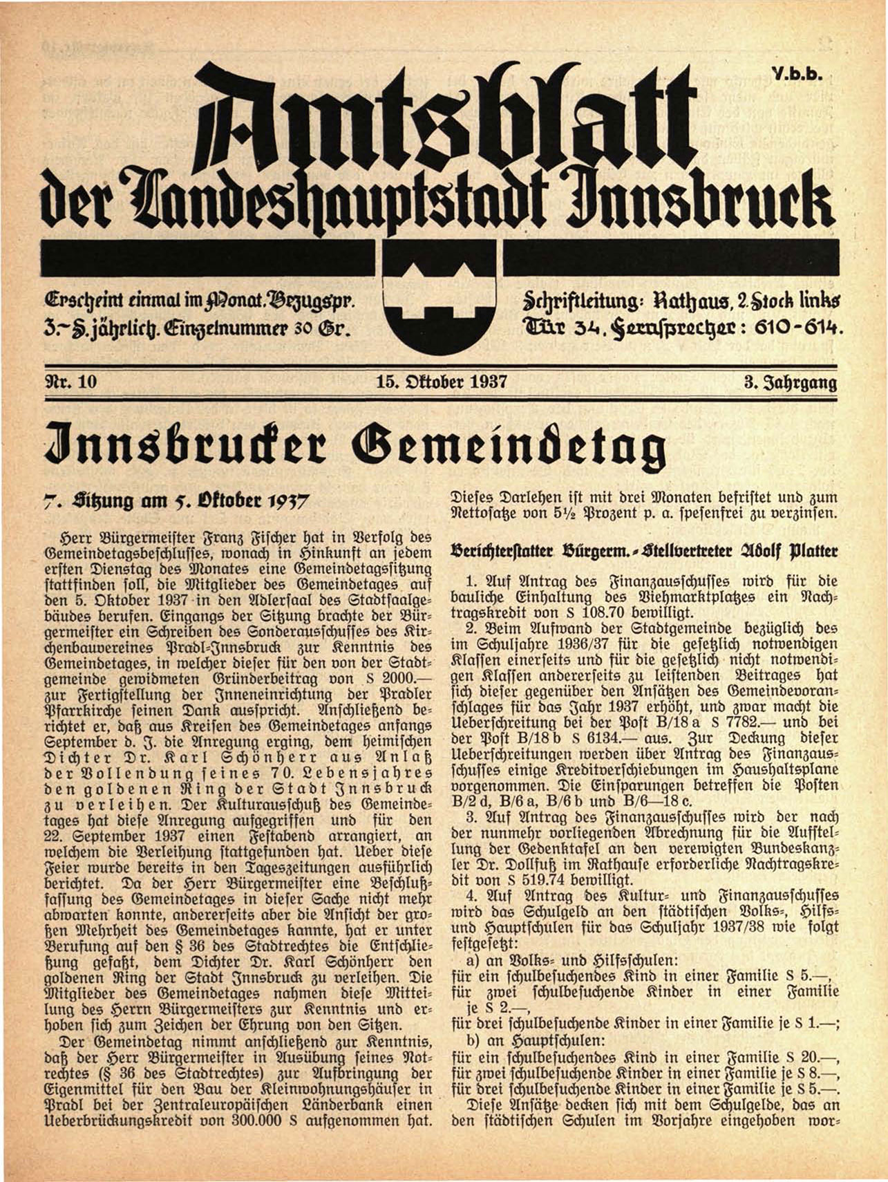 den 5. Oktober 1937 in den Adlersaal des Stadtsaalgebaudes berufen. Eingangs der Sitzung brachte der Bürgermeister ein Schreiben des Sonderausschusses des Kirchenbauvereines Pradl-Innsbruck zur Kenntnis des