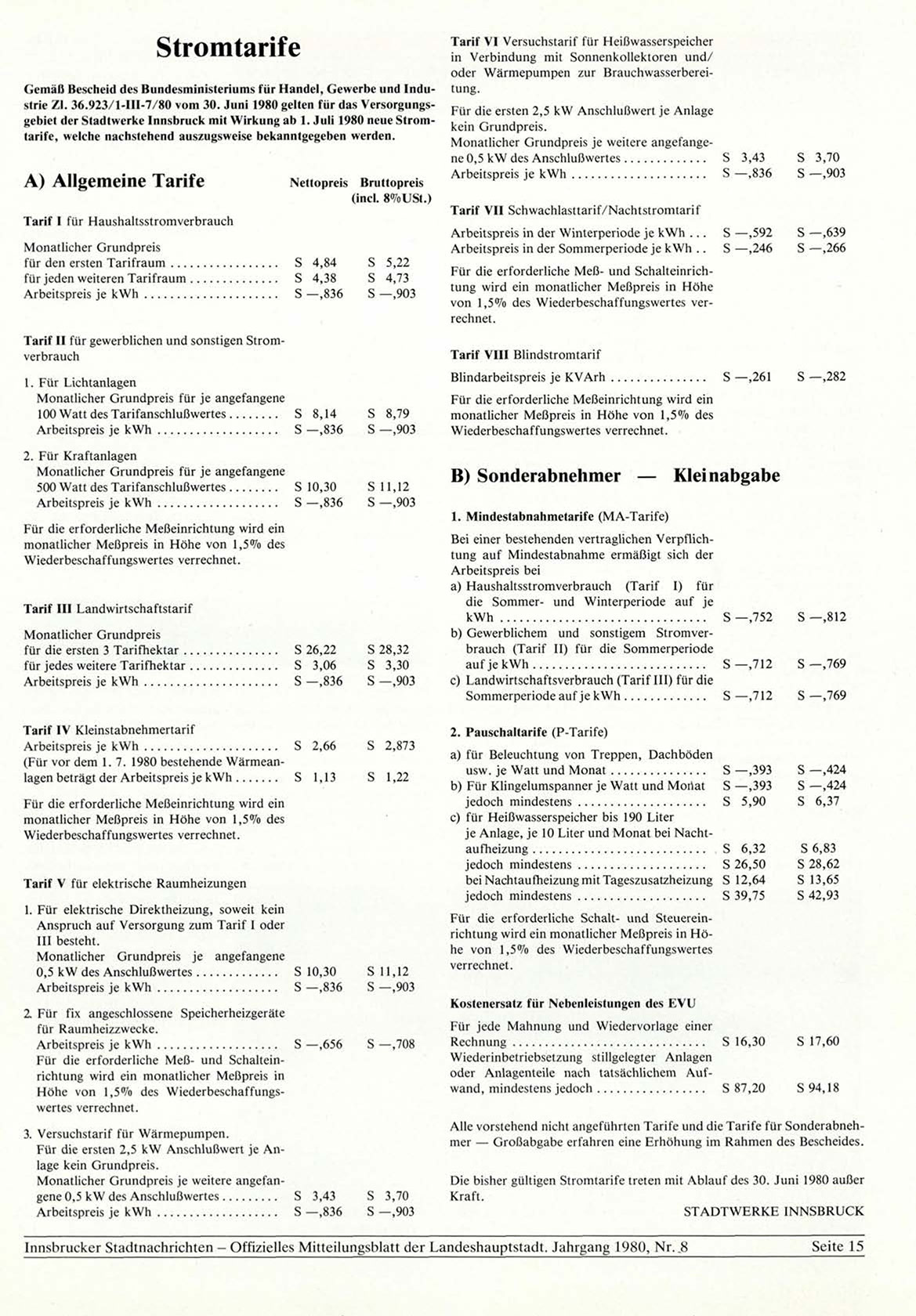 Gemäß Bescheid des Bundesministeriums für Handel, Gewerbe und Industrie ZI. 36.923/1-III-7/80 vom 30. Juni 1980 gelten für das Versorgungsgebiet der Stadtwerke Innsbruck mit Wirkung ab 1. Juli 1980 neue Stromtarife, welche nachstehend auszugsweise bekanntgegeben werden.
