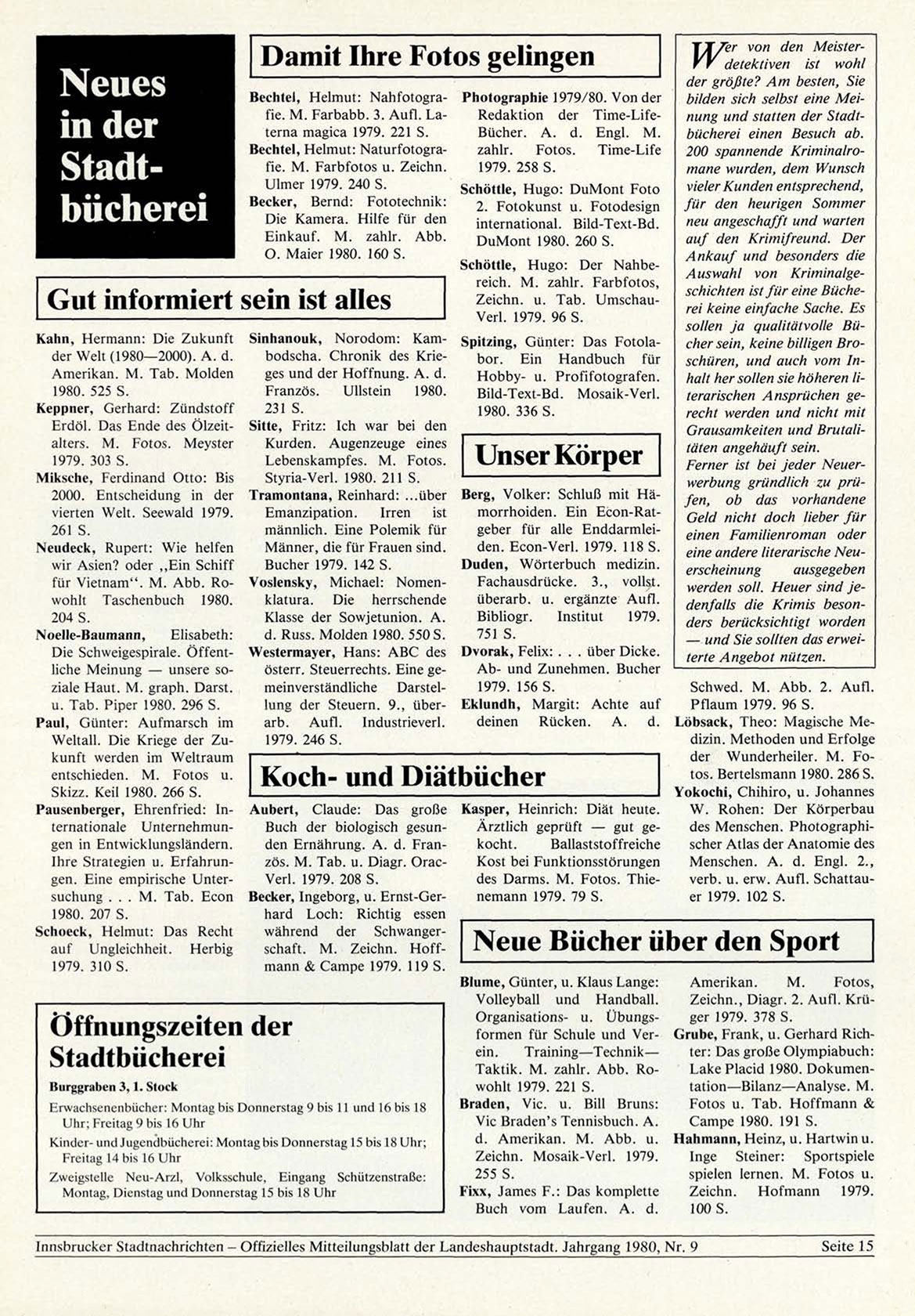Innsbrucker Stadtnachrichten — Offizielles Mitteilungsblatt der Landeshauptstadt. Jahrgang 1980, Nr. 9