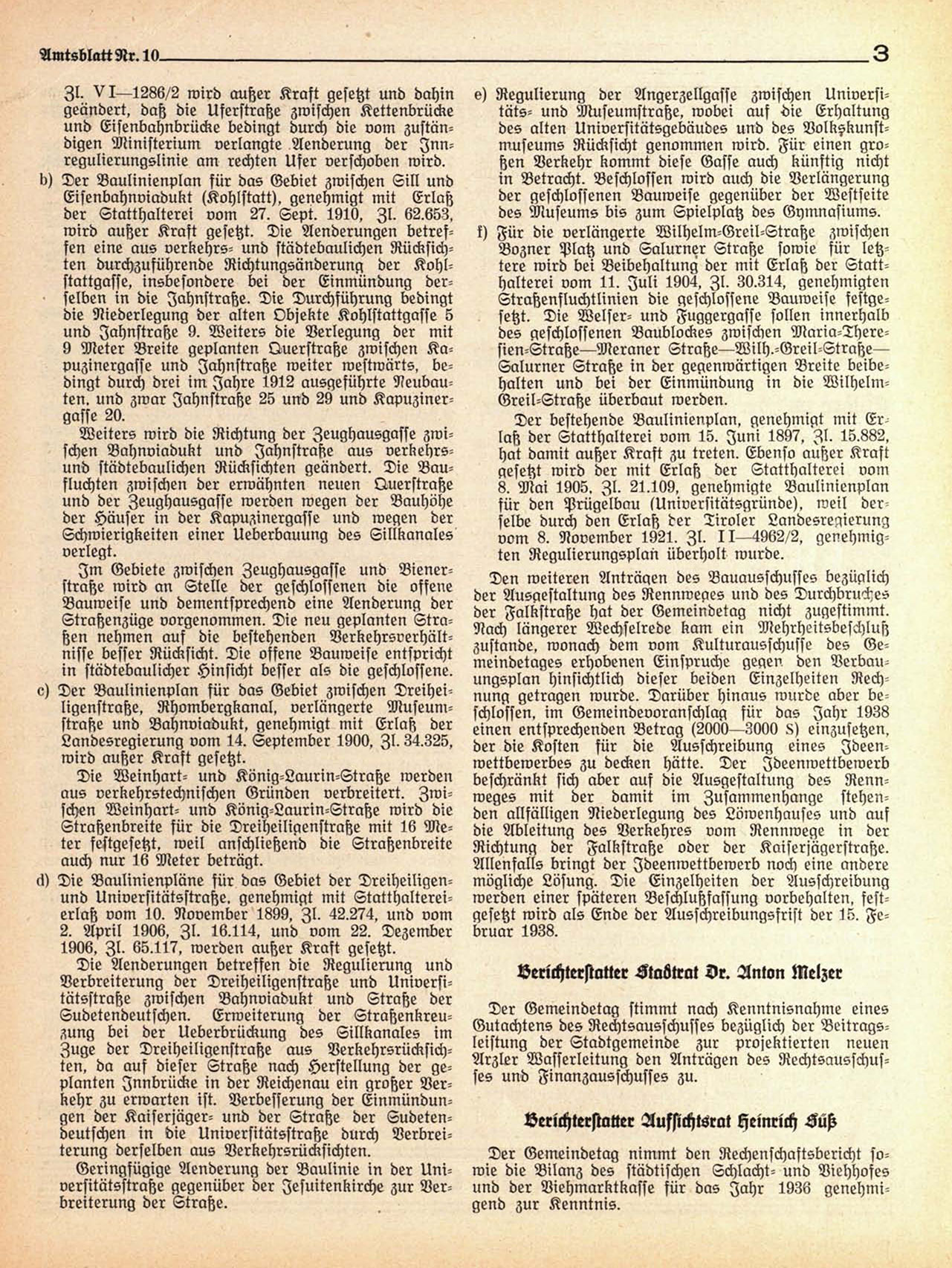 Zuge der Dreiheiligenstraße aus Verkehrsrücksichten, da auf dieser Straße nach Herstellung der geplanten Innbrücke i n der Reichenau ein großer Verkehr zu erwarten ist. Verbesserung der Einmündungen der Kaiserjäger- und der Straße der Sudetendeutschen in die Universitätsstraße durch Verbreiterung derselben aus Verkehrsrücksichten.