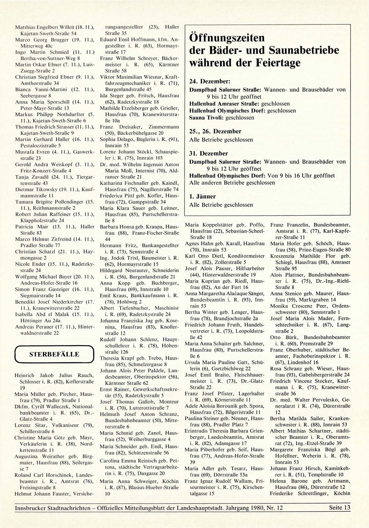 Mustafa Evren (4. 11.), Gaswerk- Lorenz Johann Stöekl, Schauspieler i . R. (75), Innrain 103