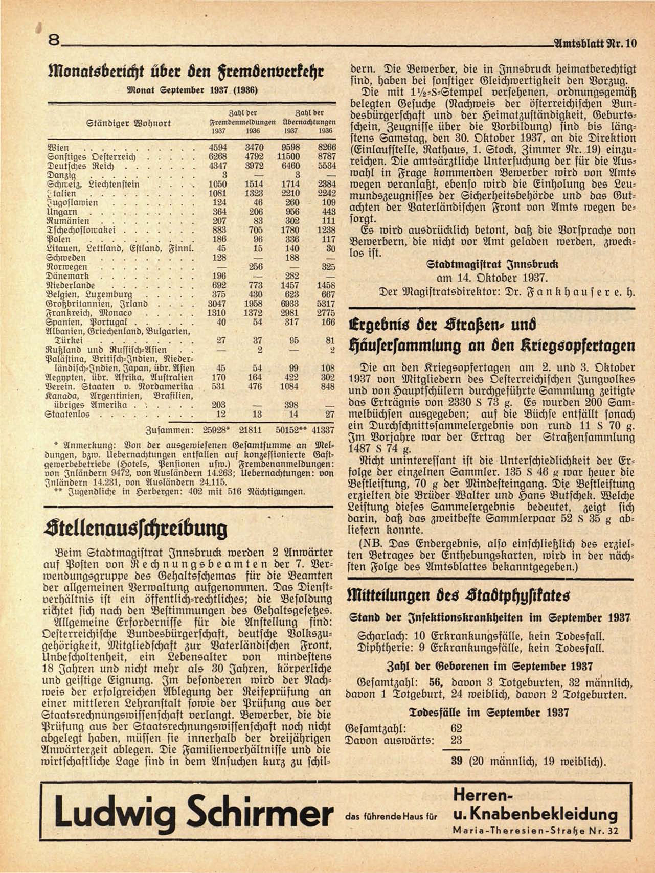 Allgemeine Erfordernisse für die Anstellung sind: Stand der Infektionskrankheiten im September 1937