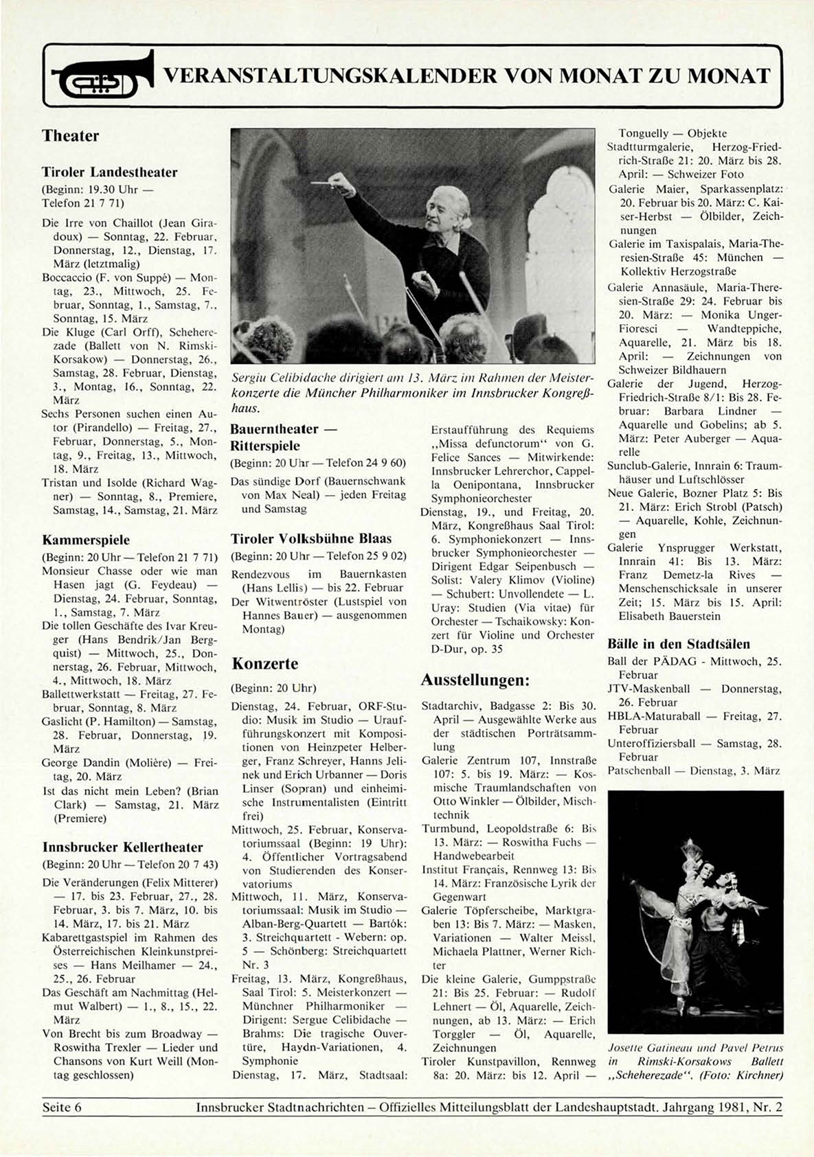 Sergiu Celibidache dirigiert am 13. März, im Rühmen der MeisterGalerie der Jugend, Herzogkonzerte die Mancher Philharmoniker im Innsbrucker Kongreß- Friedrich-Straße 8/1: Bis 28. Fehaus.