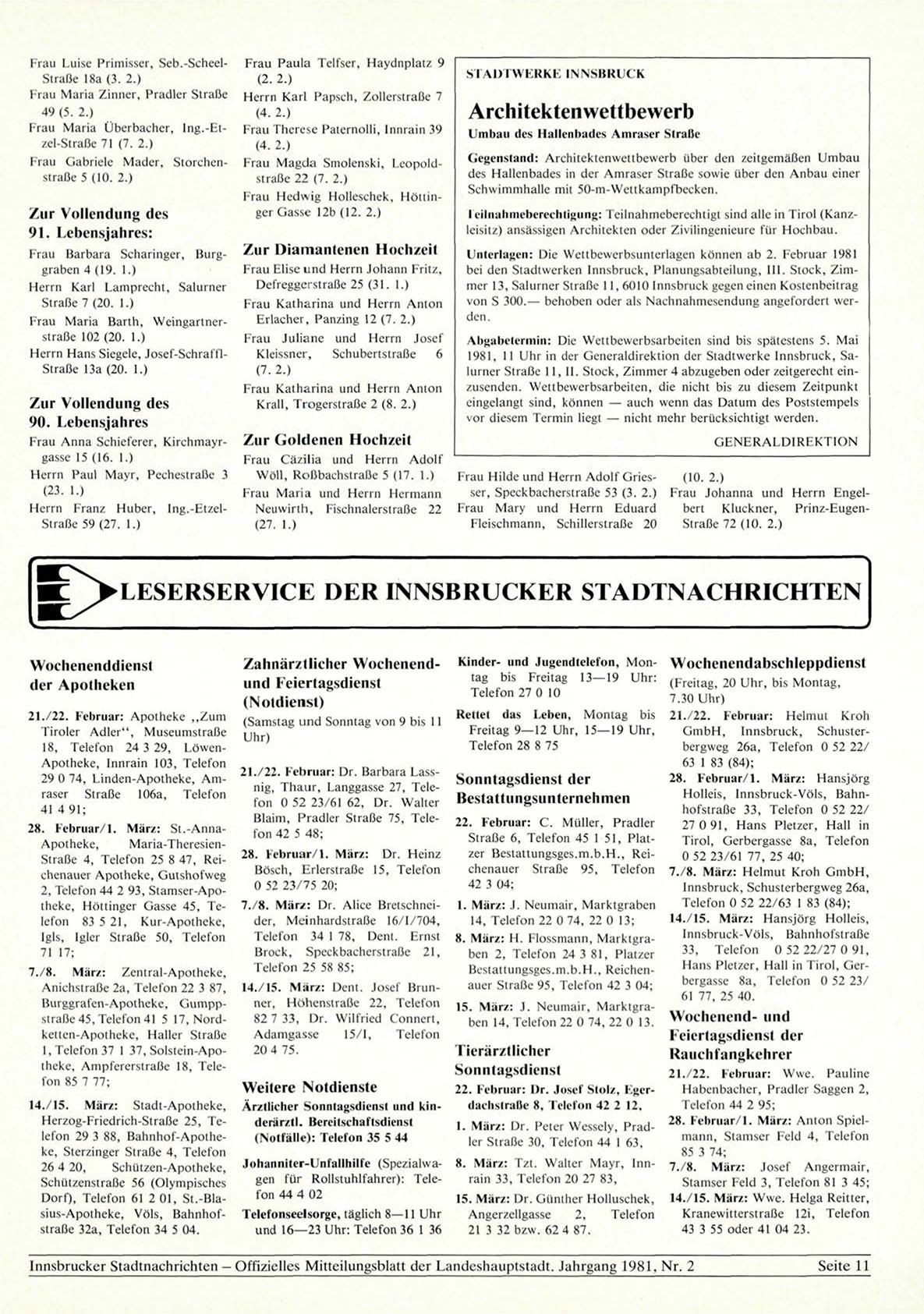 Innsbrucker Stadtnachrichten — Offizielles Mitteilungsblatt der Landeshauptstadt. Jahrgang 1981, Nr. 2