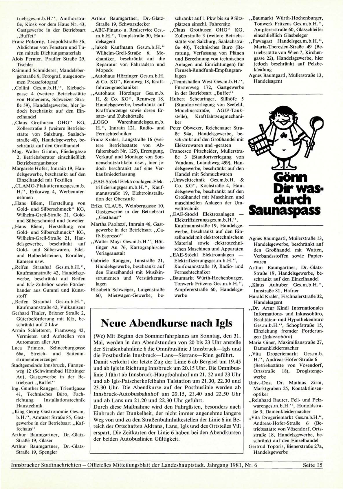 Innsbrucker Stadtnachrichten — Offizielles Mitteilungsblatt der Landeshauptstadt. Jahrgang 1981, Nr. 6